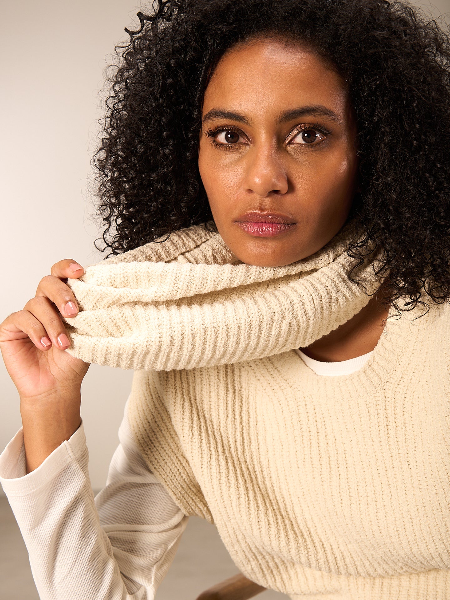 Locker geschnittener Schlauchkragen im Halbpatentmuster in speziellem flauschigen Bouclé-Garn. Ideal als Ergänzung zum Pullunder oder der Jacke.