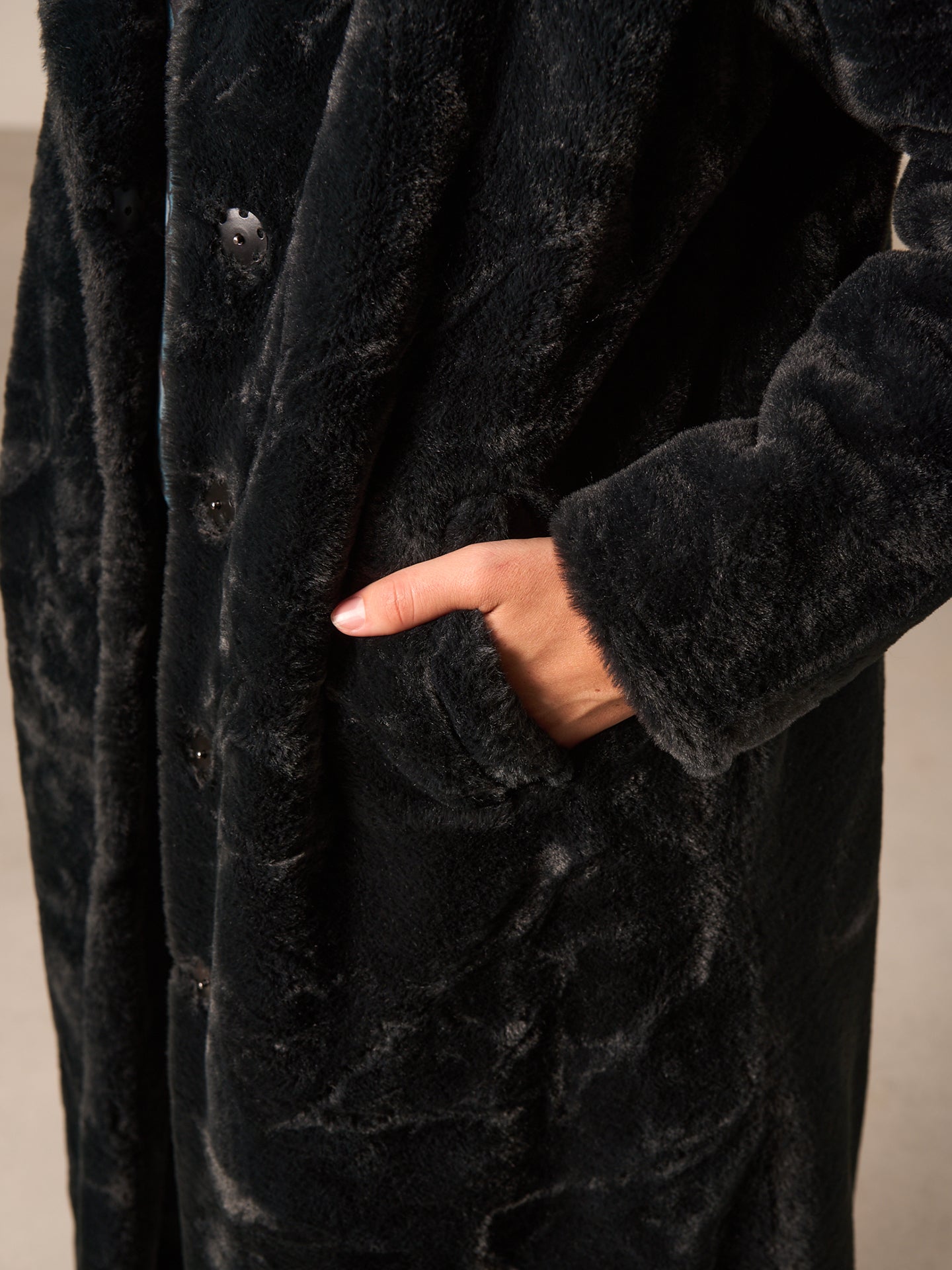 Weit und gerade geschnittener Oversize-Mantel, leicht gefüttert für angenehmen Tragkomfort. Modischer Revers-Kragen, praktische Leistentaschen und dezente Druckknöpfe. Super kuschelige Kunstfell-Qualität.