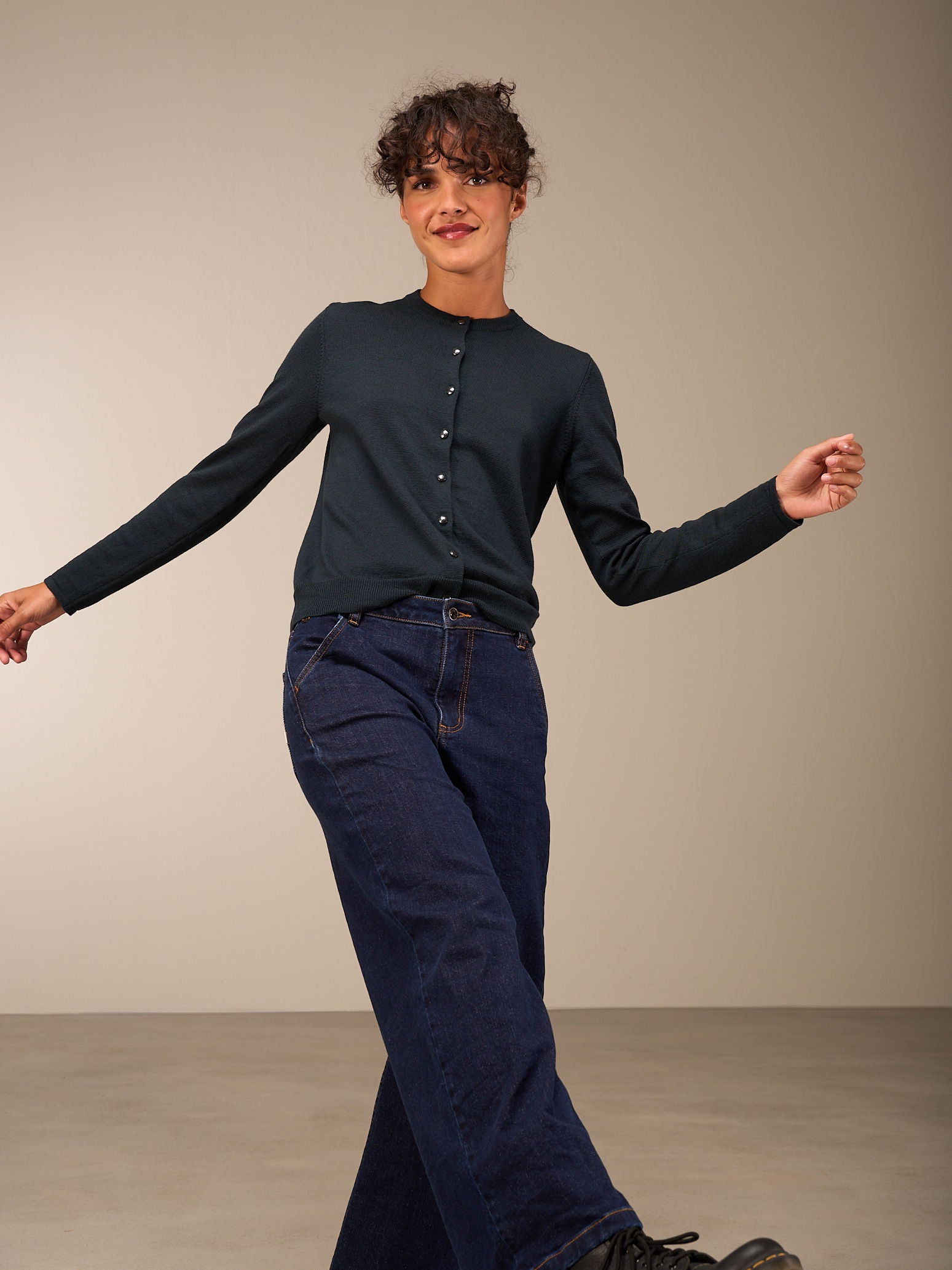 Locker, gerade geschnittene Strickjacke mit überschnittenen Schultern und wertigen Ösenknöpfen Ton in Ton. Die edle Merino Optik macht die Jacke zu einem Lieblingsteil.