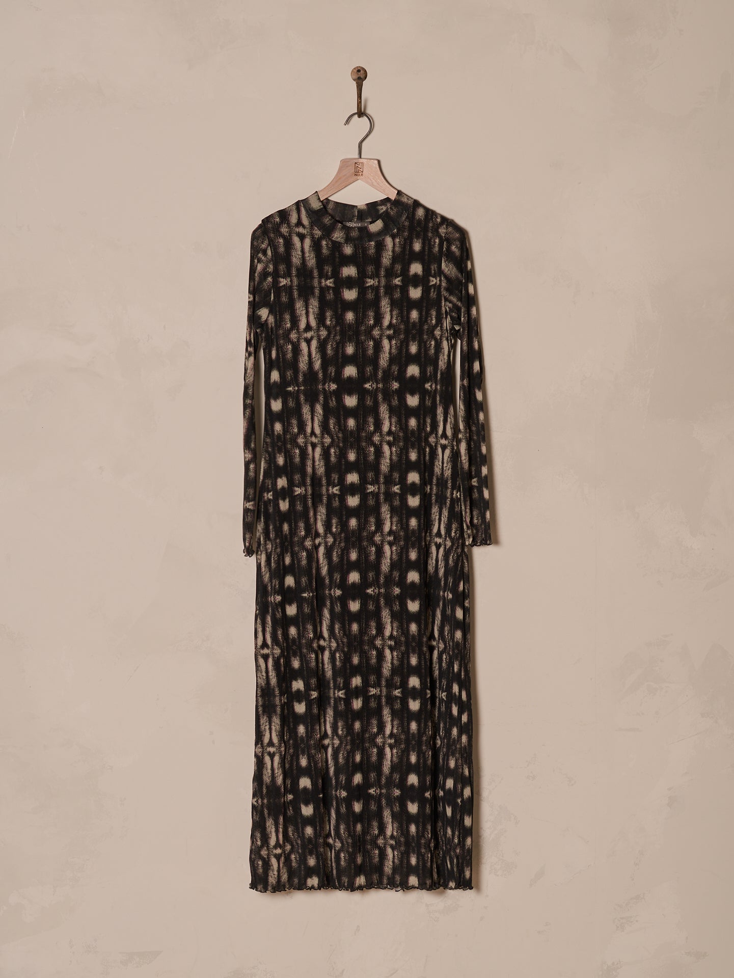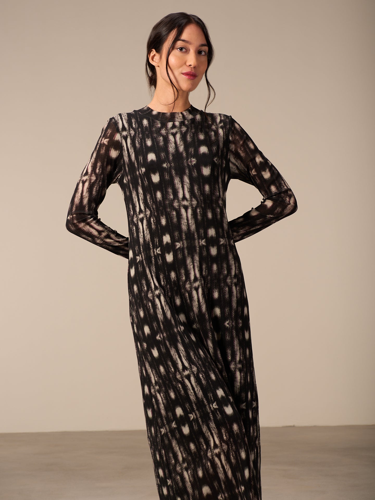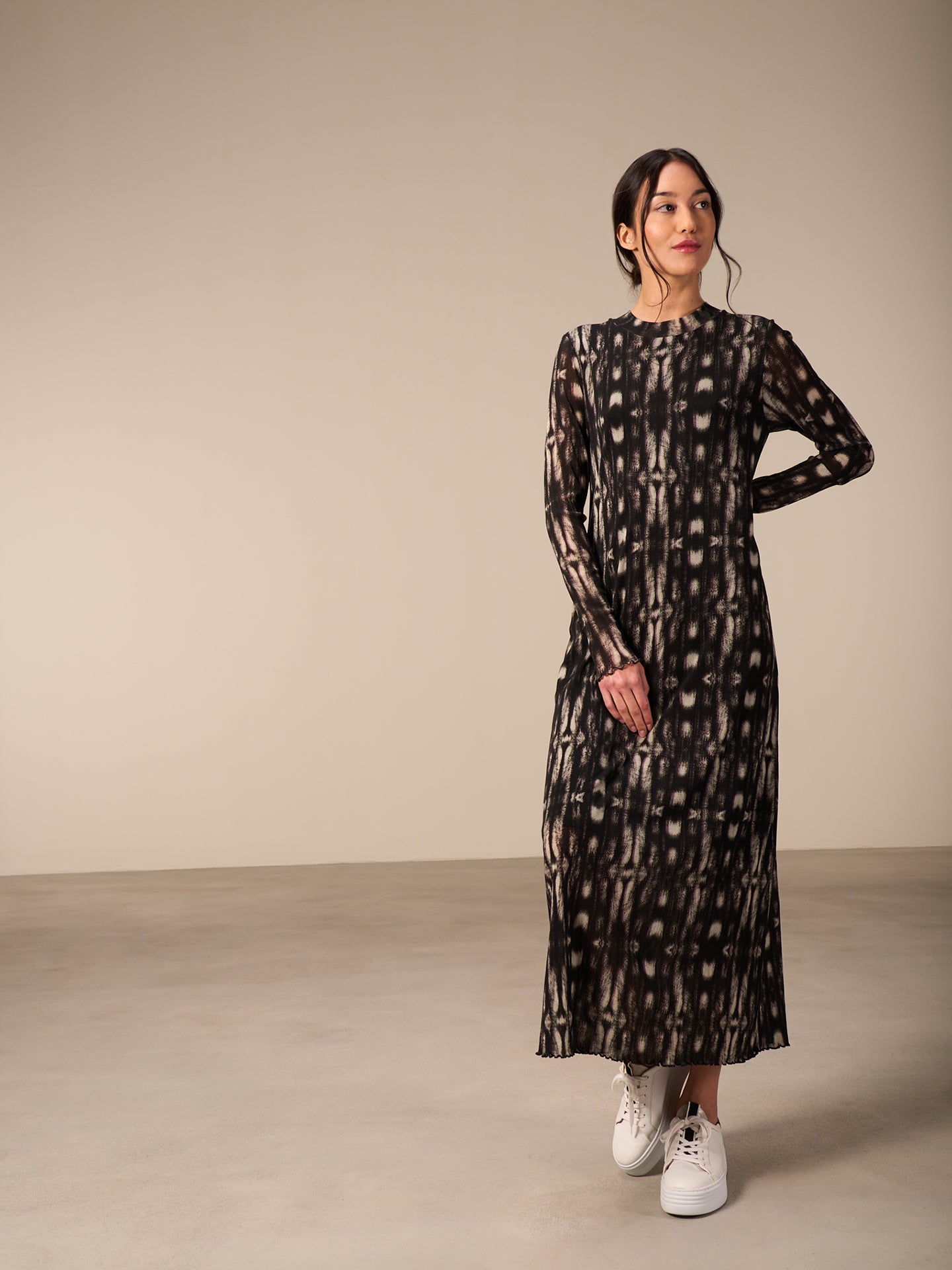 Körperbetontes langes Kleid mit kleinem Stehkragen in angesagter feiner Netzoptik und mit dezentem einfarbigen Print.