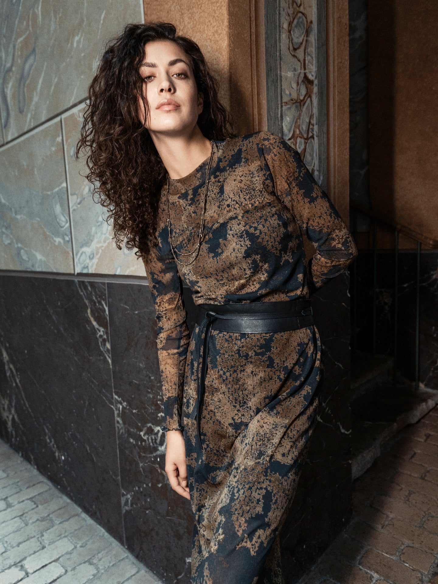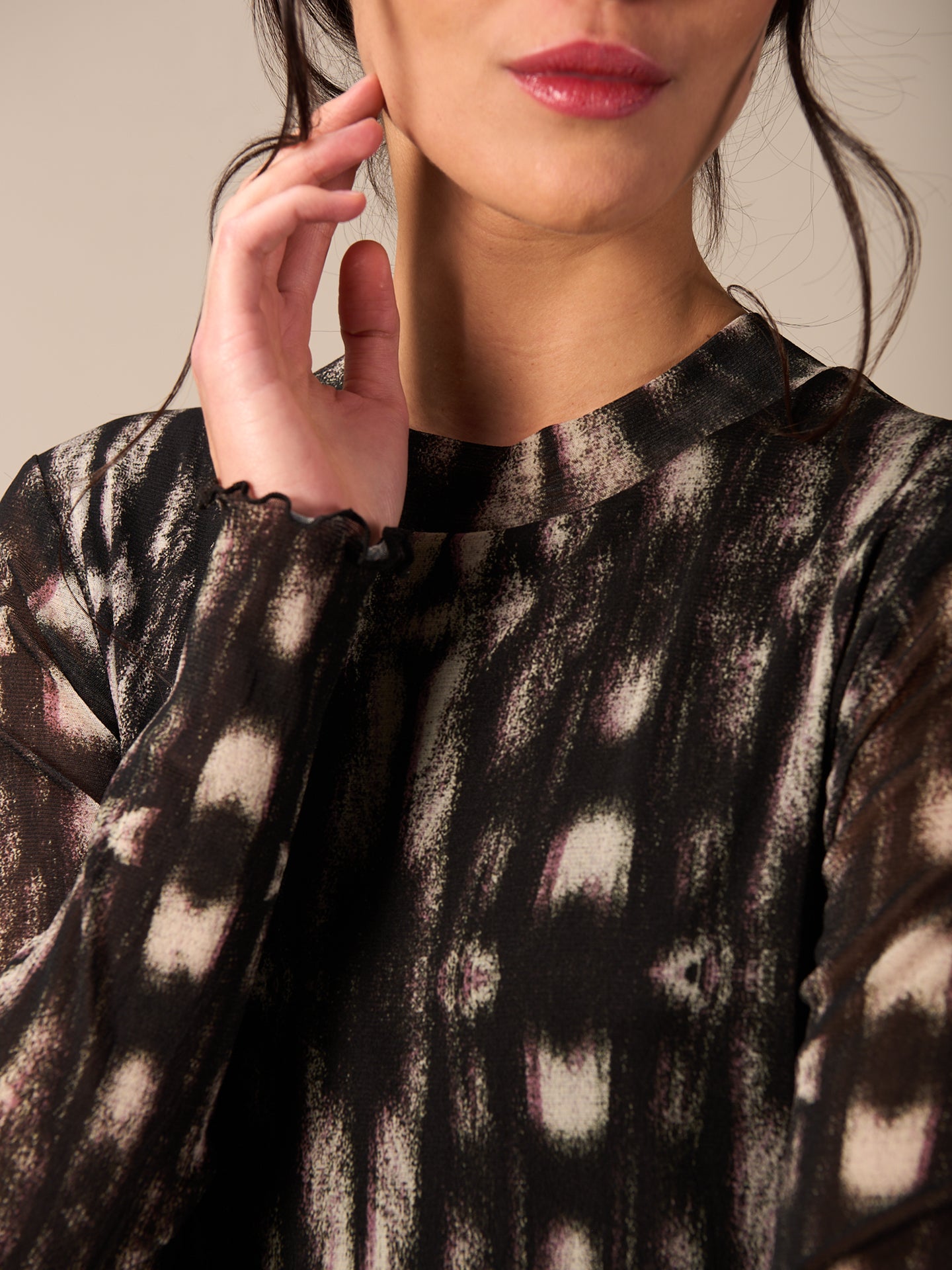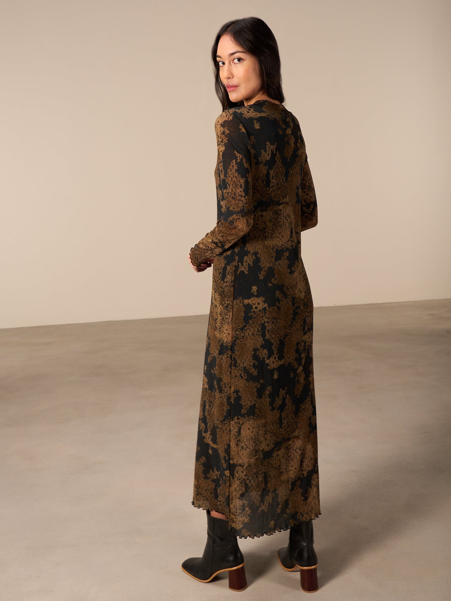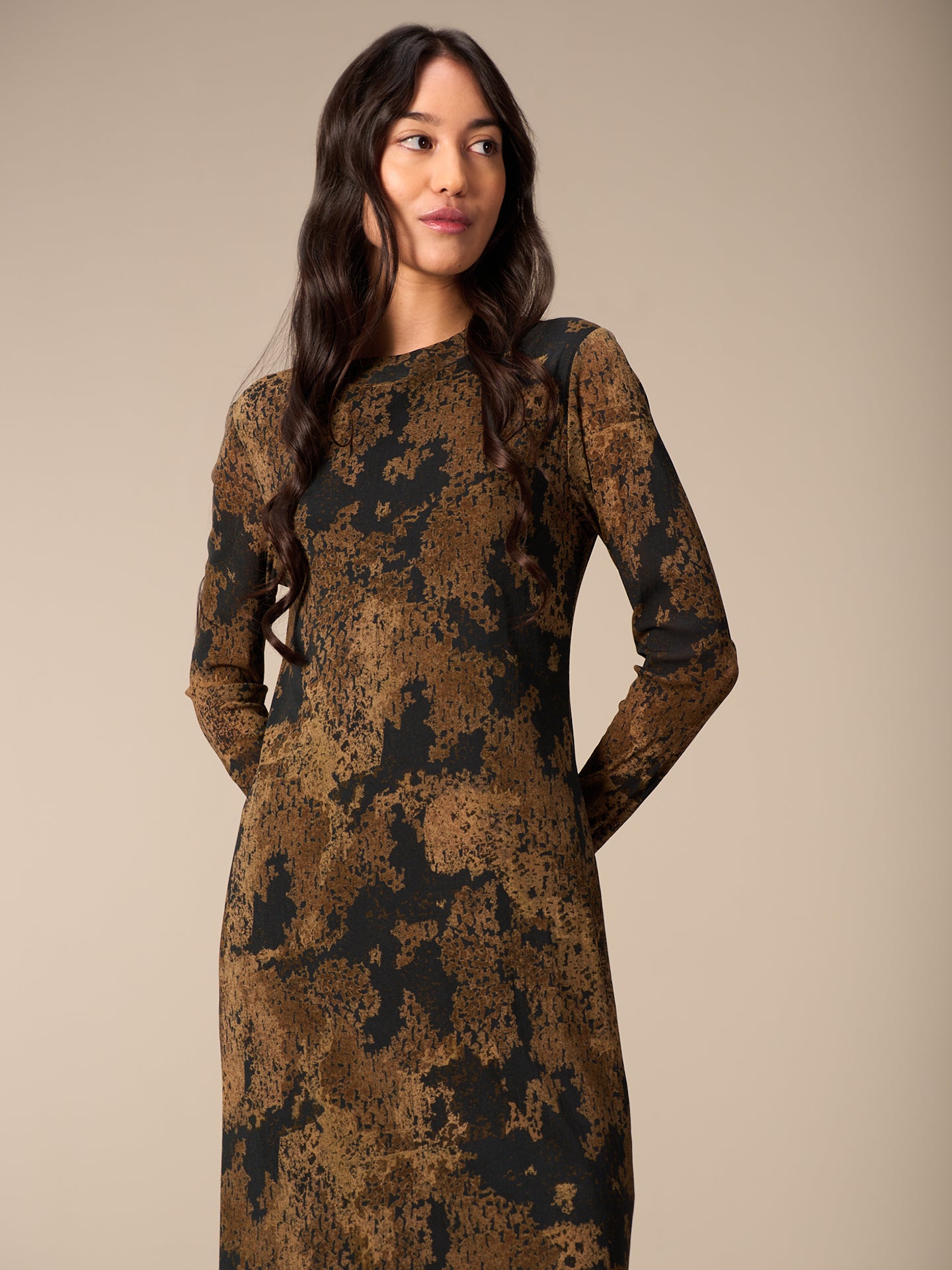 Körperbetontes langes Kleid mit kleinem Stehkragen in angesagter feiner Netzoptik und mit dezentem einfarbigen Print.