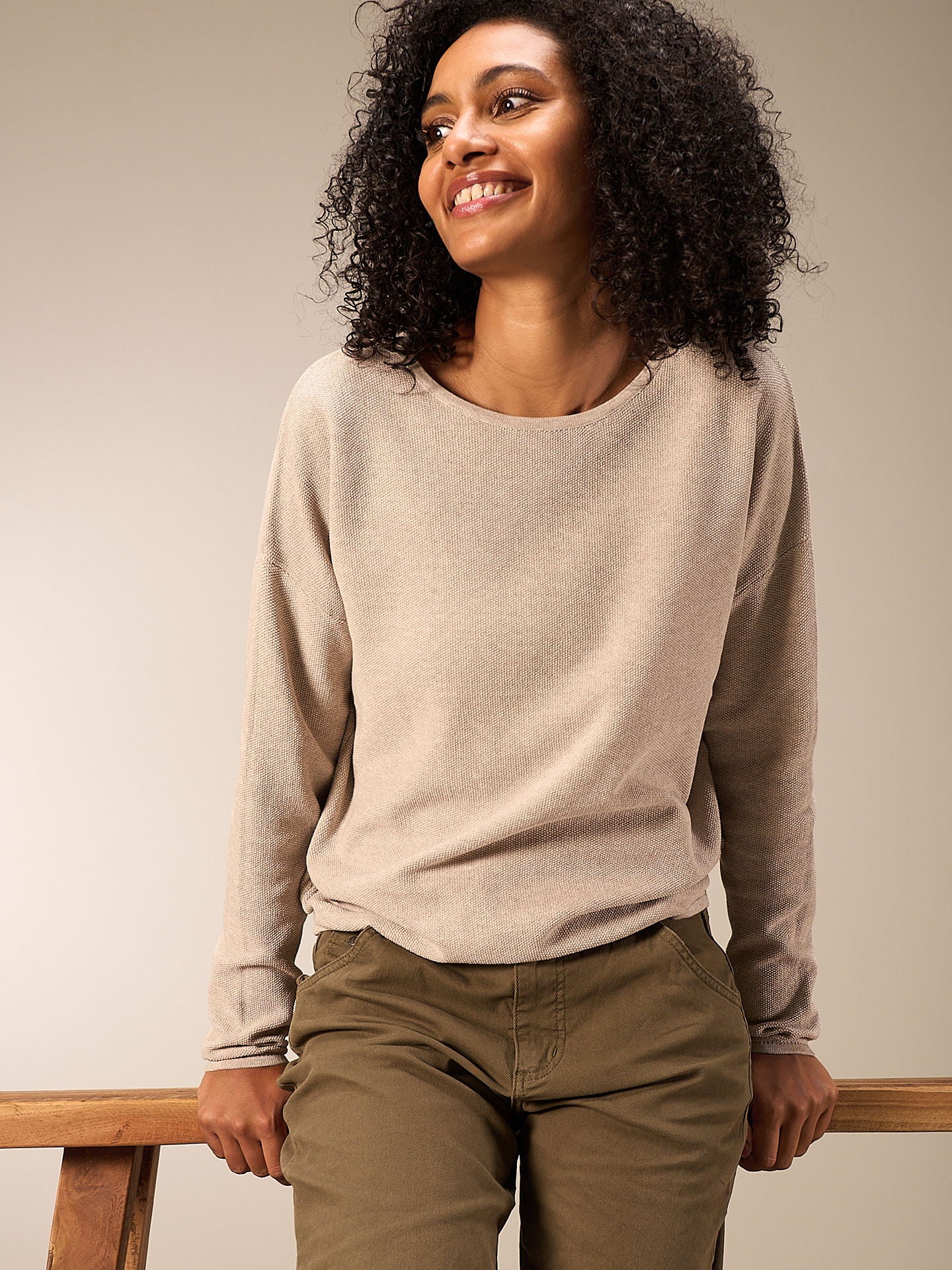 Lockerer Pullover mit U-Bootausschnitt und stark überschnittener Schulter in Halbpatentmuster und Melangegarn. 60% Bio-Baumwolle aus OCS-zertifiziertem Anbau und 40% recyceltes Polyester. Der Organic Content Standard (OCS) überprüft den Anteil an biologisch angebauten Materialien in einem Endprodukt und stellt durch lückenlose Rückverfolgbarkeit sicher, dass die Angaben zum biologischen Materialanteil korrekt sind.