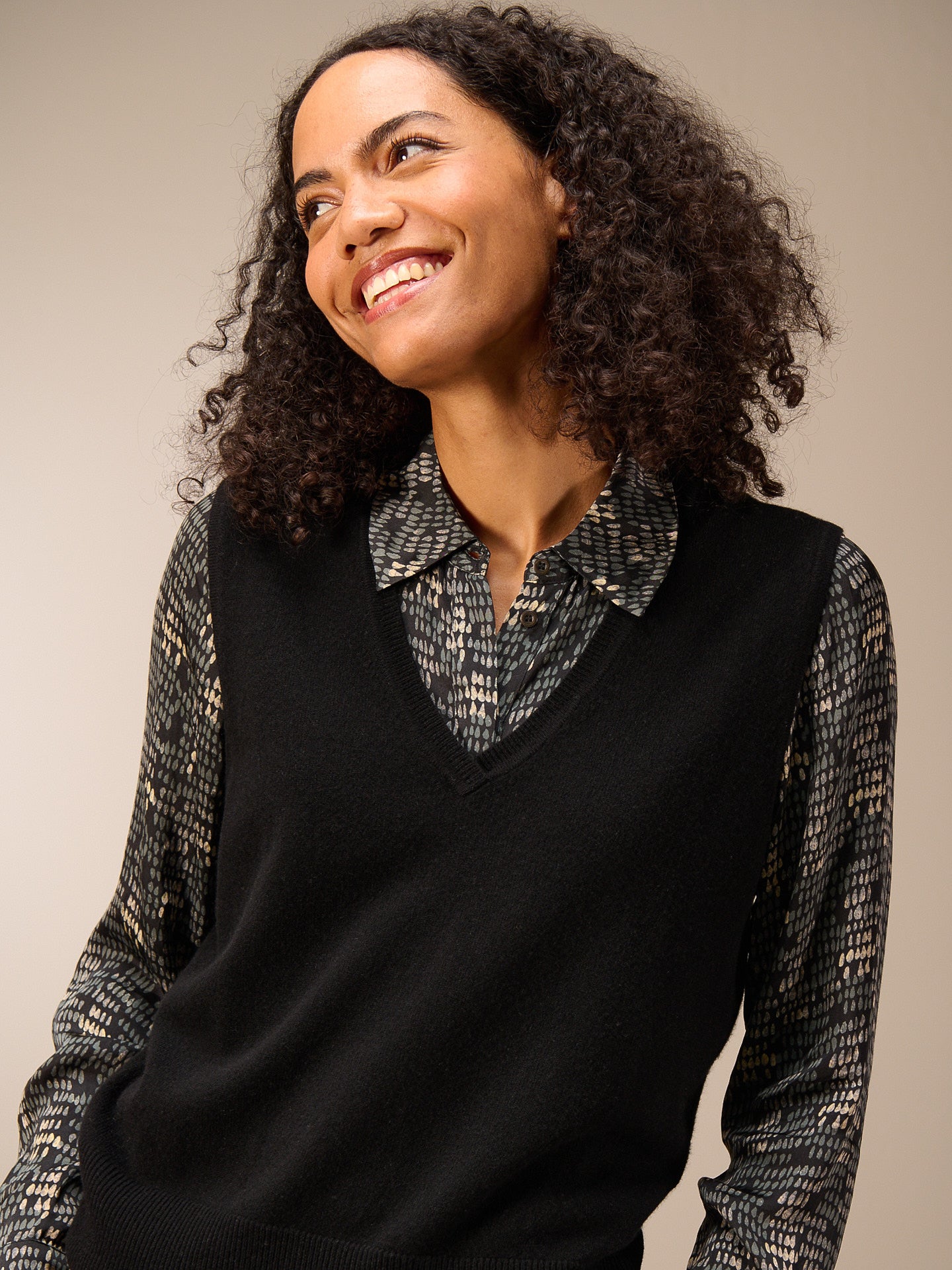 Pullunder mit schmalen Schultern und einer Rippenborte am Saum. Ideal über Blusen oder Shirts zu tragen. Das edle weiche Wolle/Kaschmir Material sorgt für ein einzigartiges Tragegefühl.
