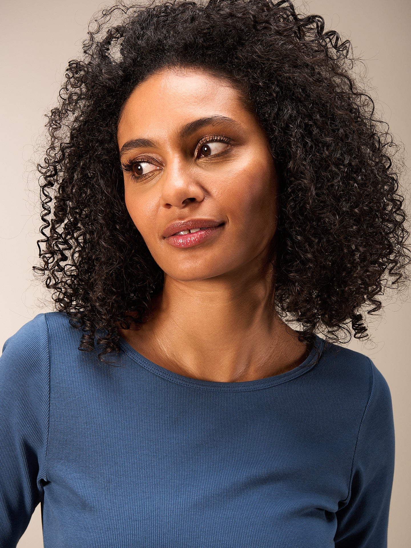 Figurbetontes Kurzarmshirt mit U-Bootausschnitt in weicher Rippqualität. Stückgefärbt. 94% GOTS-zertifizierte Bio-Baumwollqualität und 6% Elasthan.