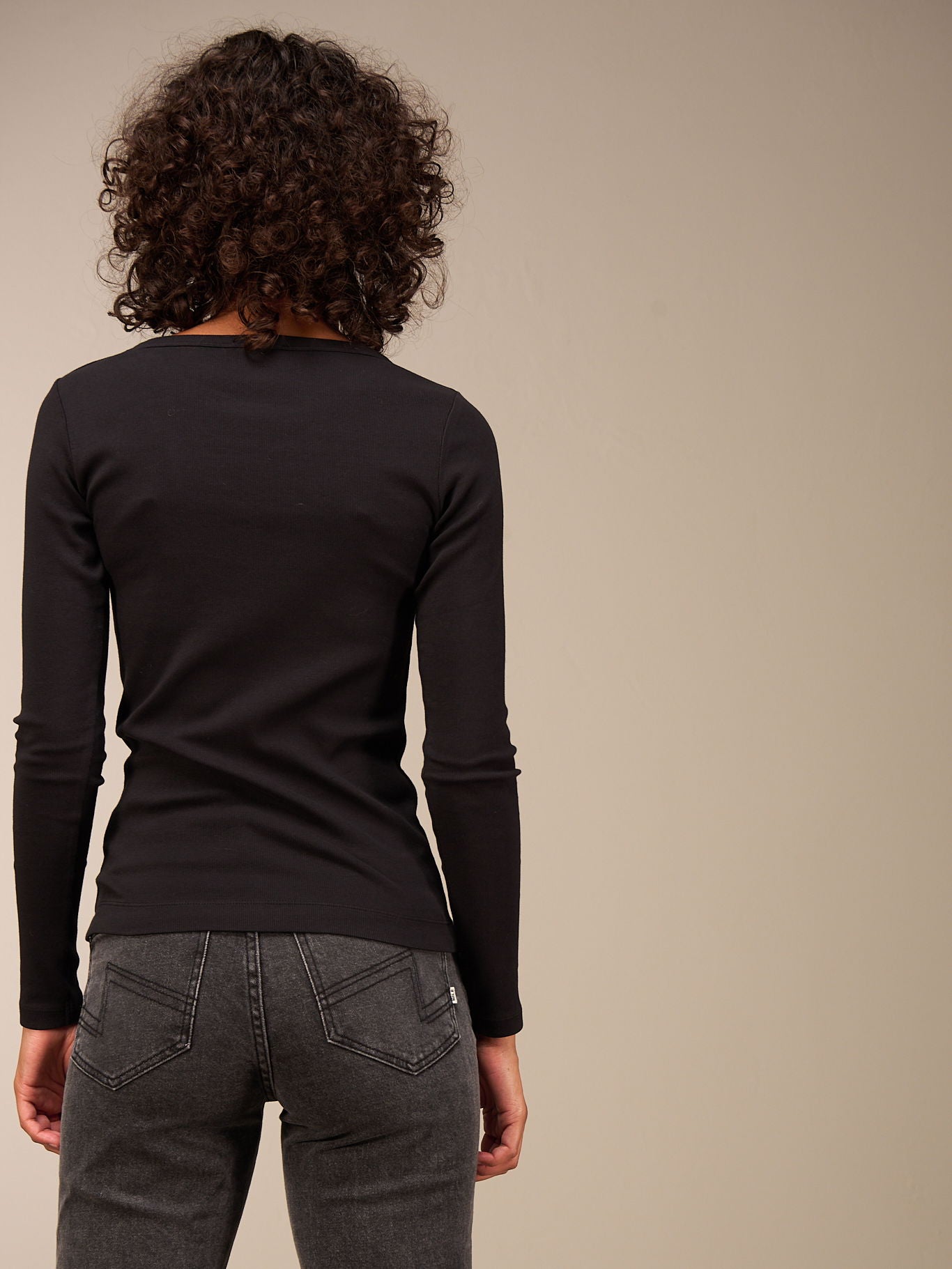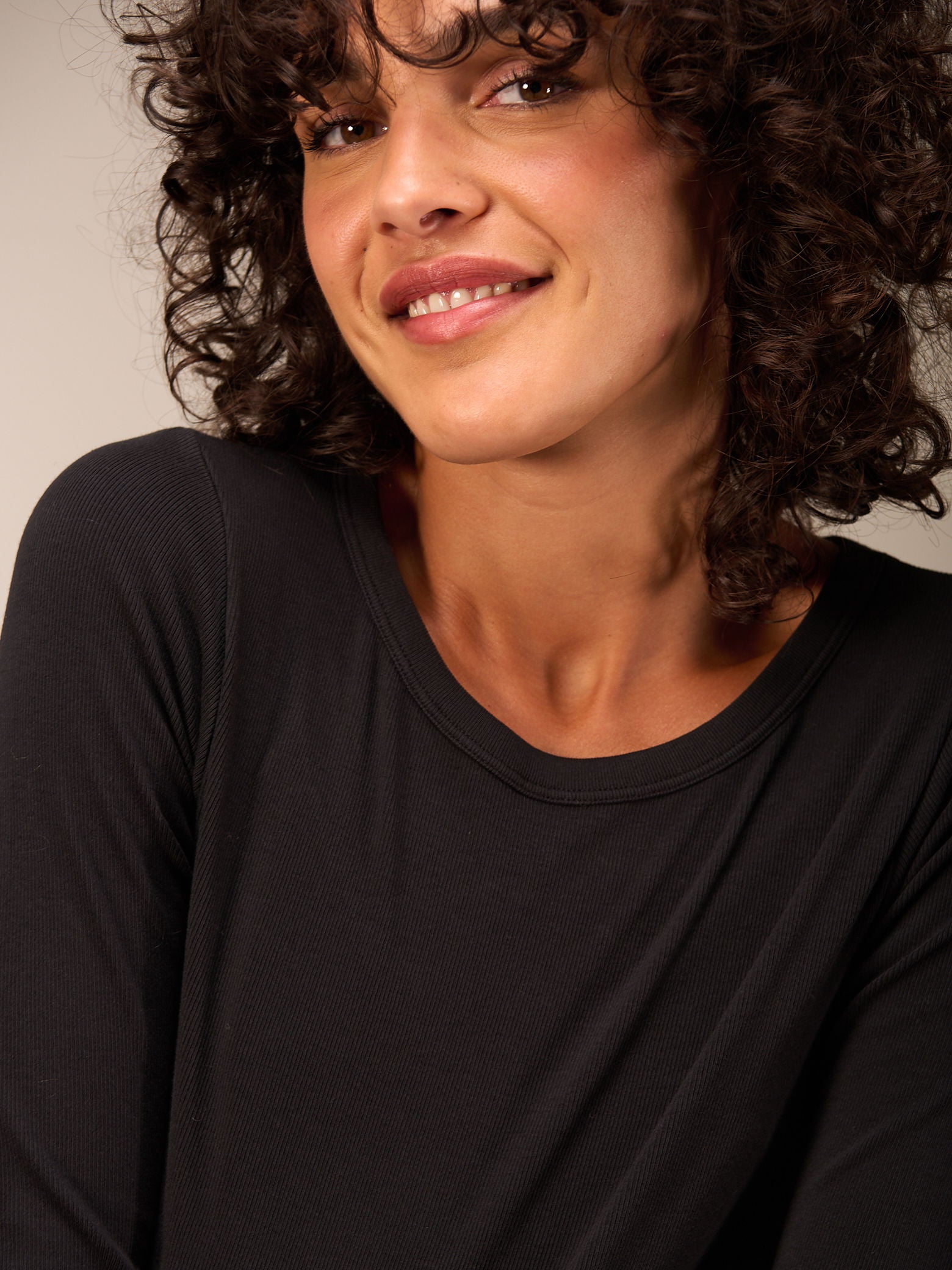 Figurbetontes Langarmshirt mit hohem Rundhalsausschnitt in weicher Rippqualität. Stückgefärbt.