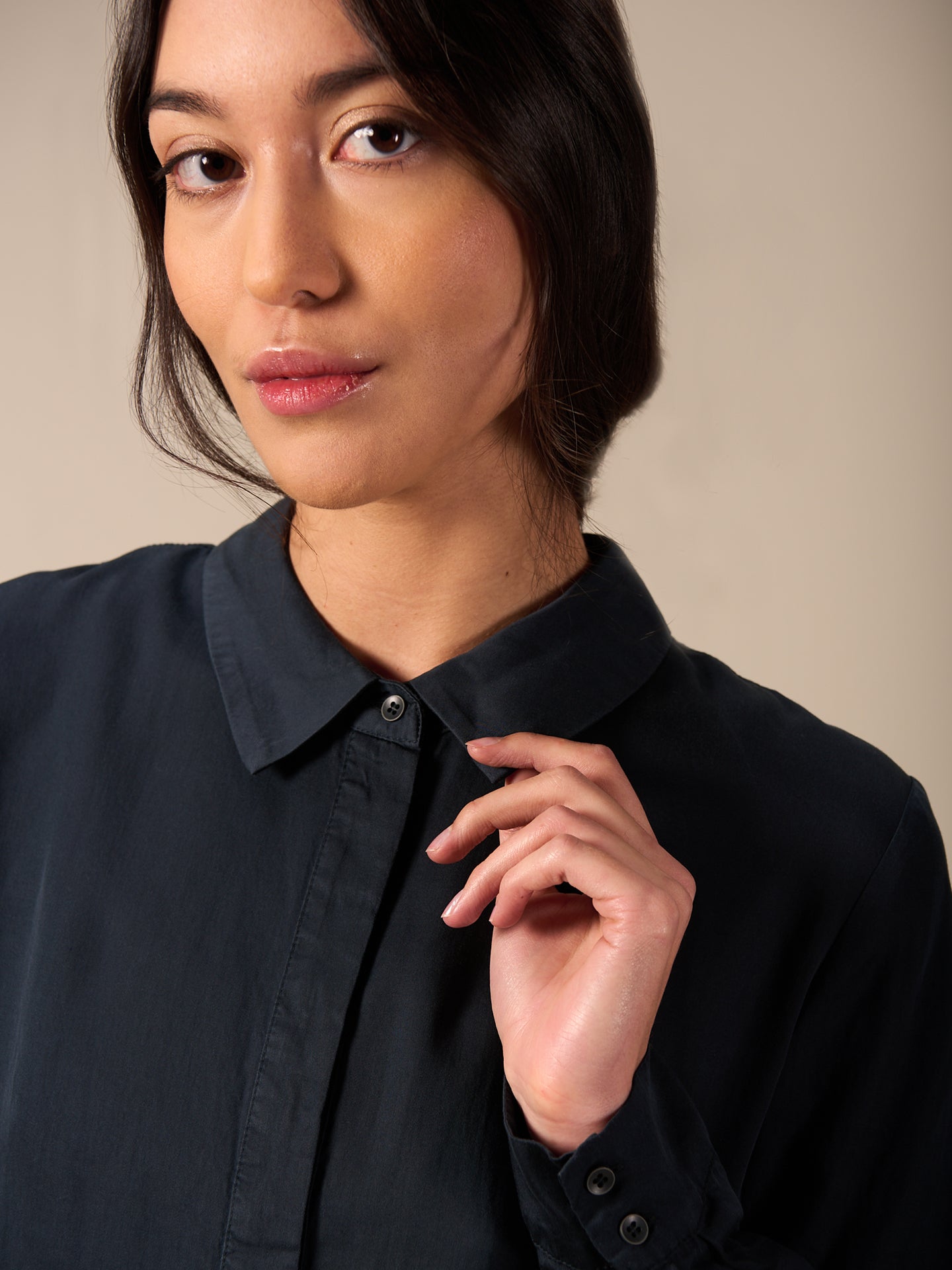 Edel schimmernde Satinblouse in leichter A-Linie mit verdeckter Knopfleiste und langen Ärmel mit Schlitz und Manschette.