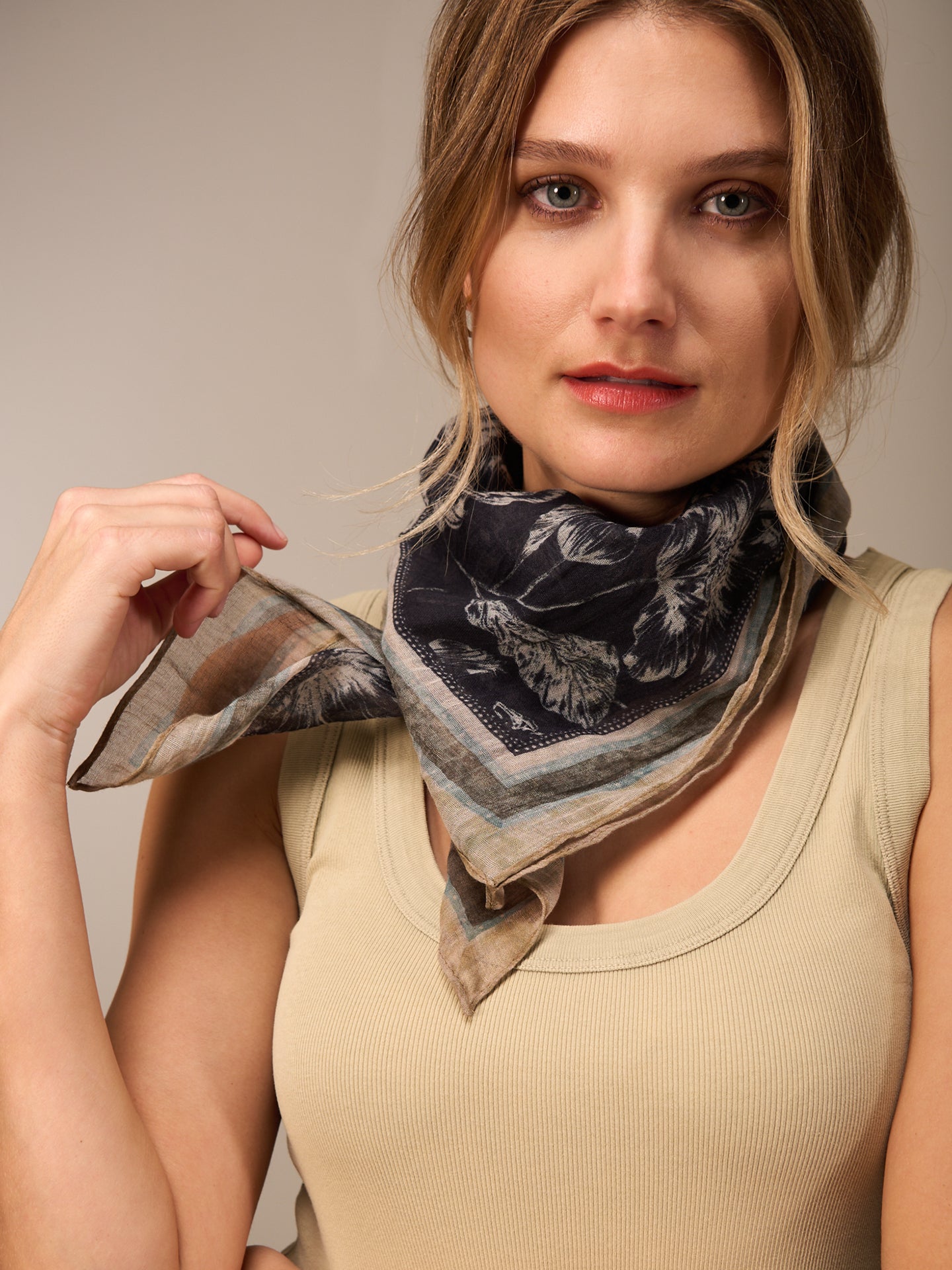Lässiger Schal in der Grösse 90 x 90 cm wertet jedes Outfit im Nu auf und wird so zu einem Lieblingsaccessoire. Der Schal ist vollflächig bedruckt, die Kanten abgesteppt und aus 100% Bio-Baumwolle aus zertifiziertem Anbau.