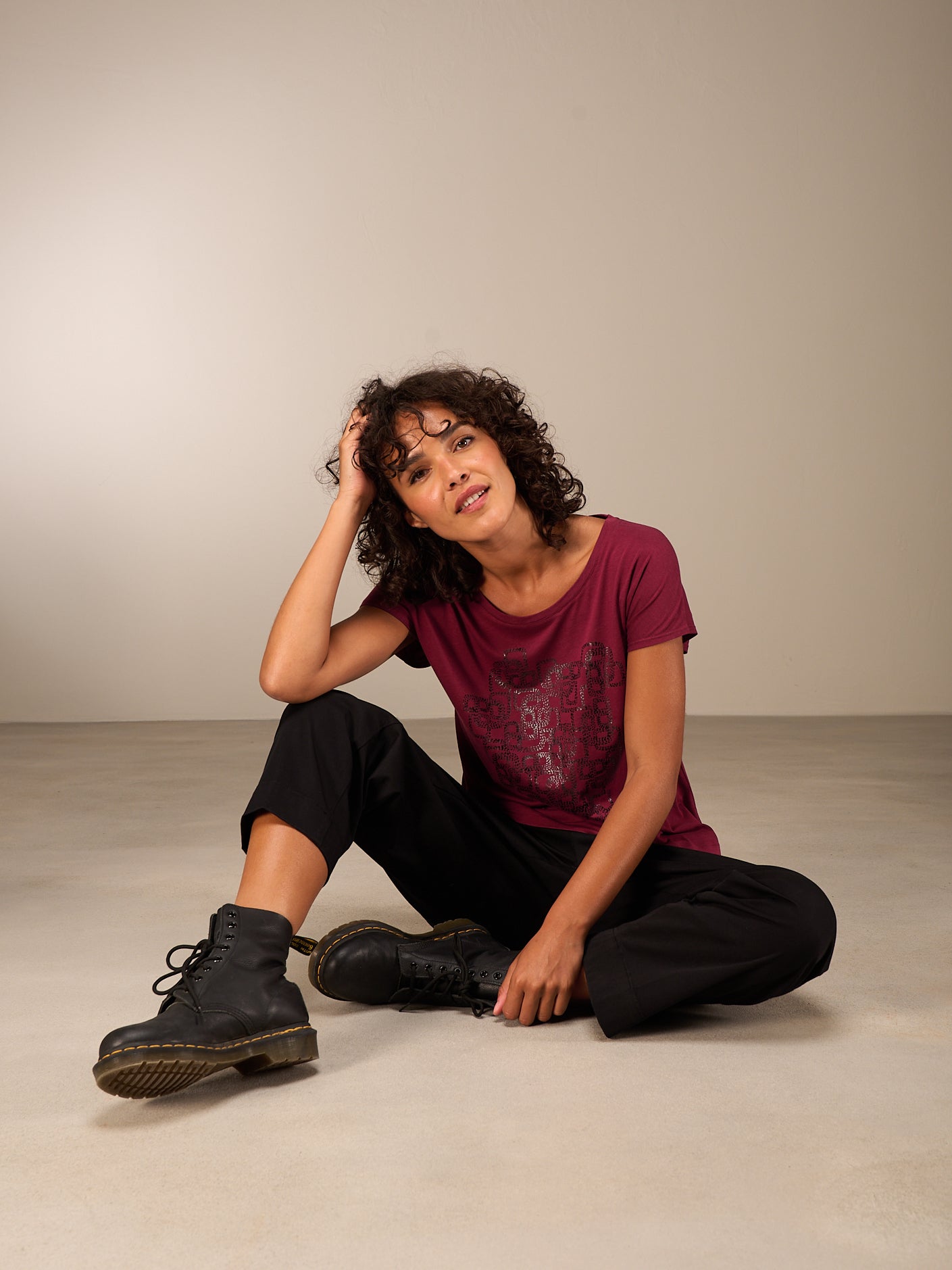 Locker geschnittenes Rundhalsshirt mit platziertem Druck. Die mit Lochspitze versehenen Nähte im Rückenteil verleihen diesem wertigen Shirt noch das gewisse Etwas.