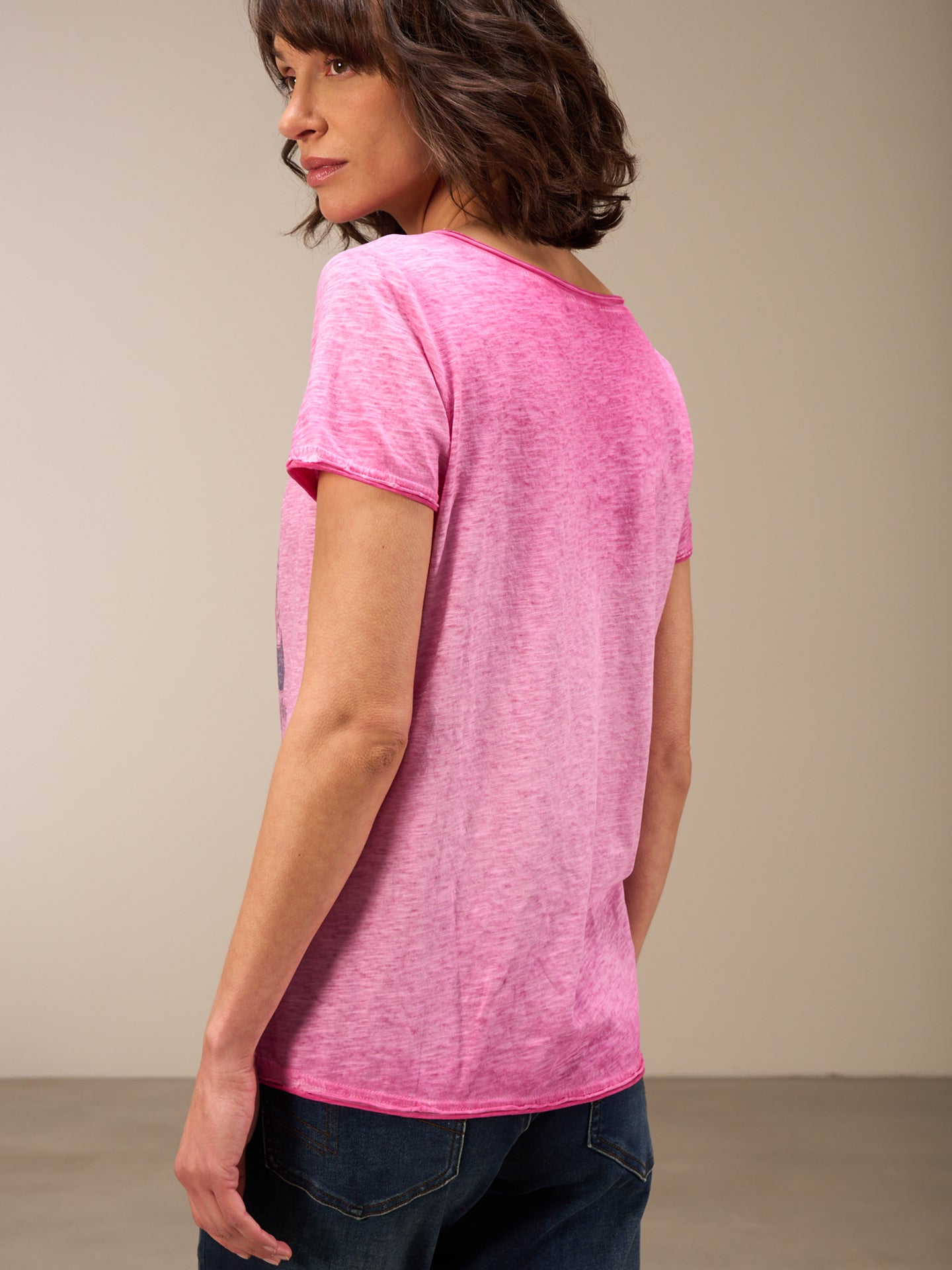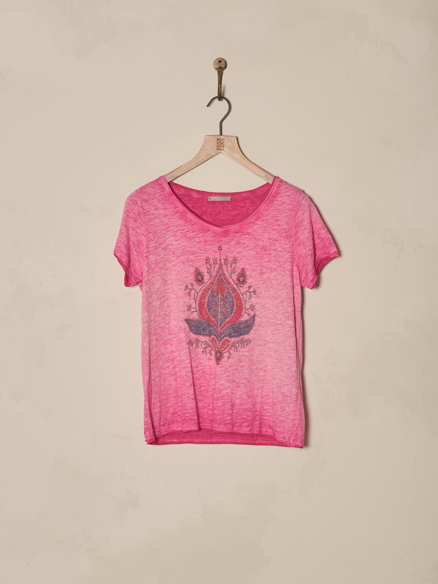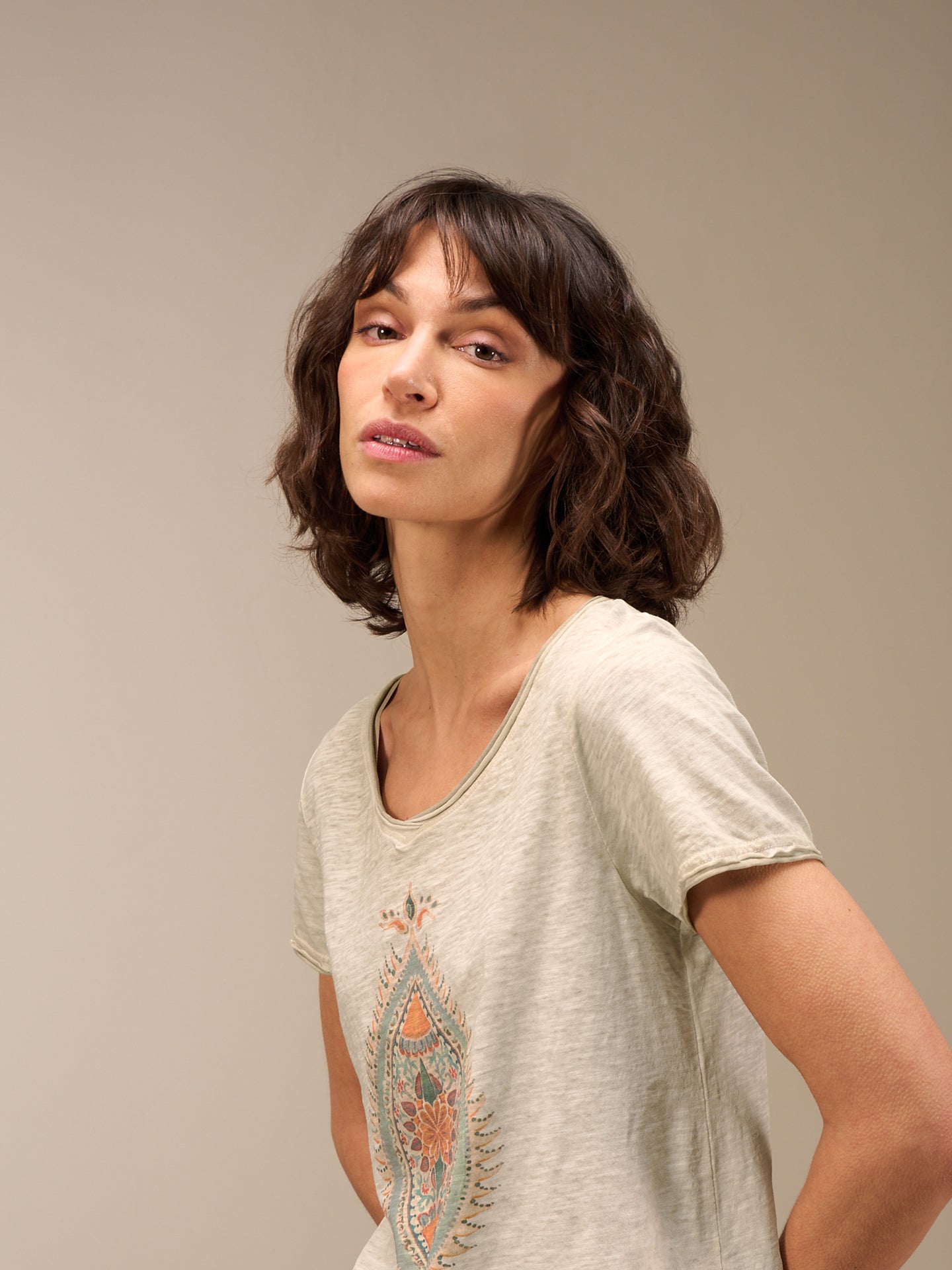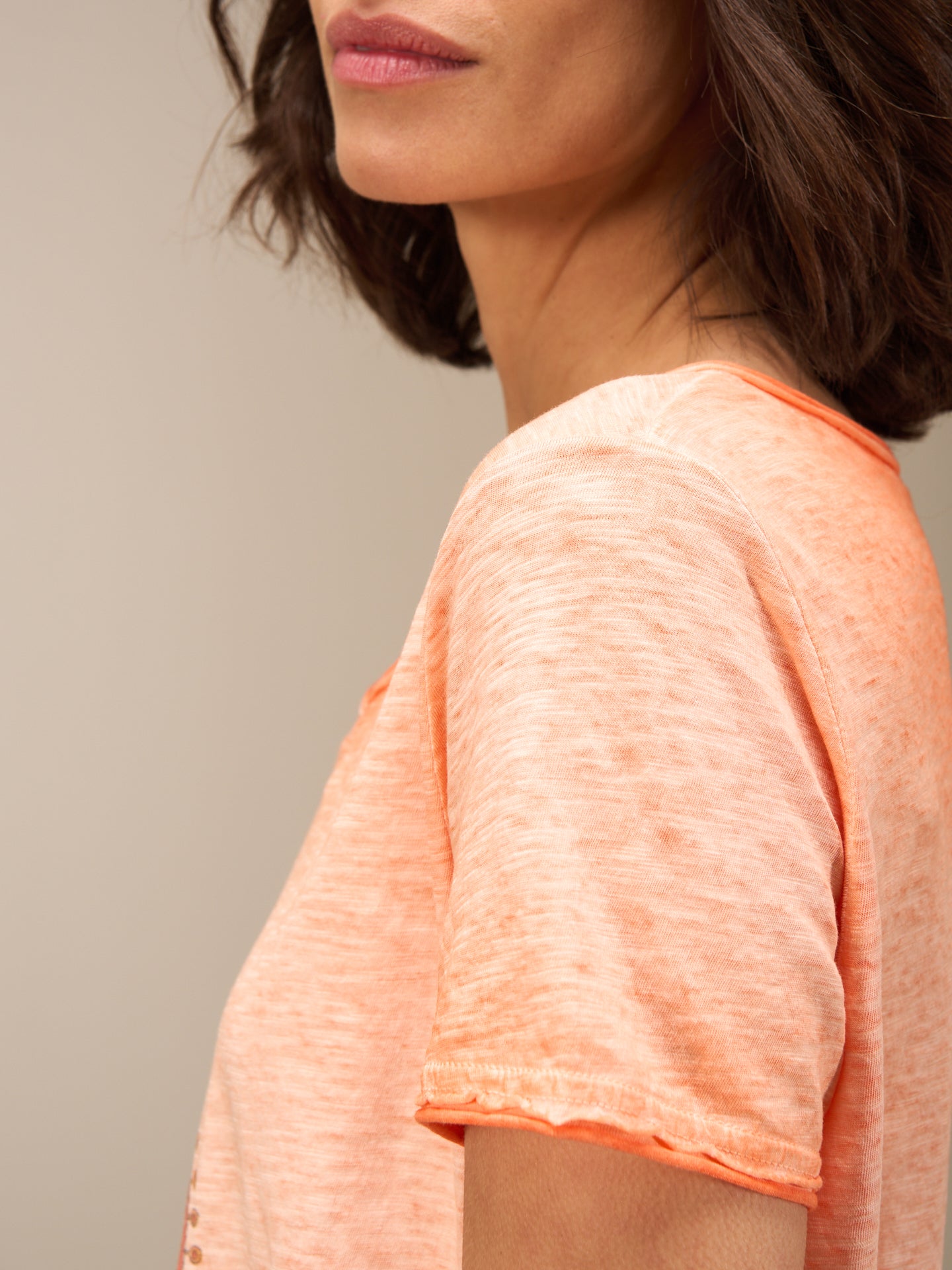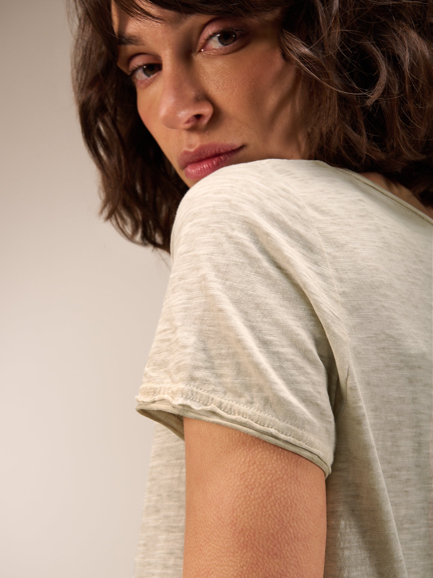 Locker geschnittenes T-shirt aus geflammtem Jersey mit platziertem Druck und offenkantigem V-Ausschnitt. 100% GOTS-zertifizierte Bio-Baumwollqualität. Durch ein spezielles inwendiges Färbeverfahren erhält das Shirt einen schönen ausgewaschenen Look. Unregelmässigkeiten in der Farbe machen das Stück einzigartig. Der Ausbleicheffekt wird verstärkt.