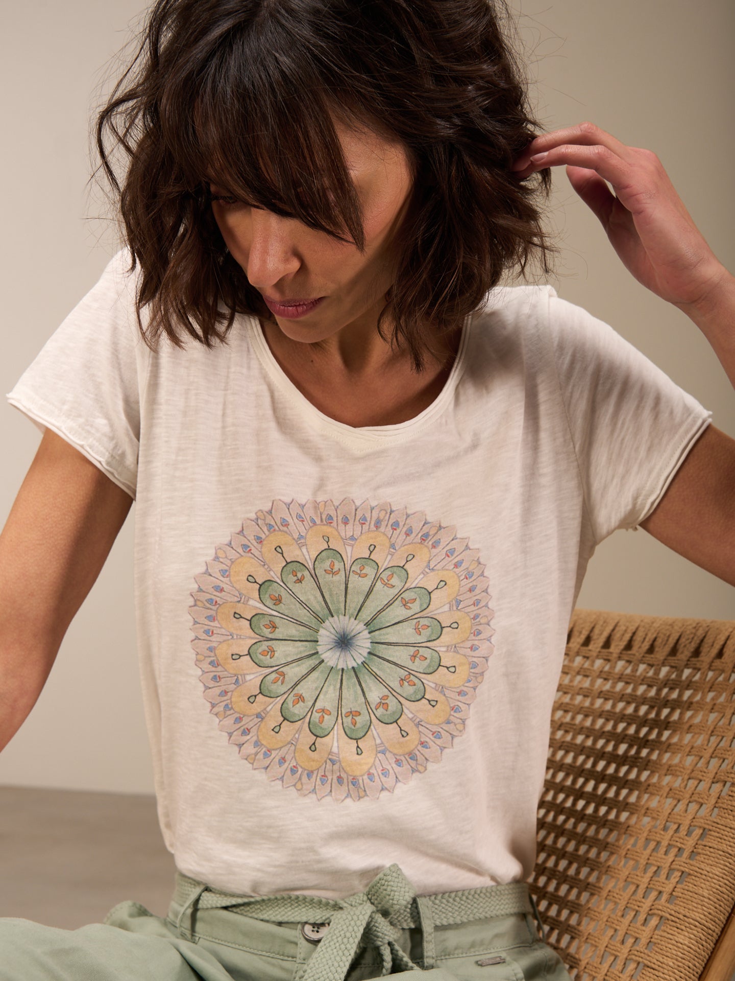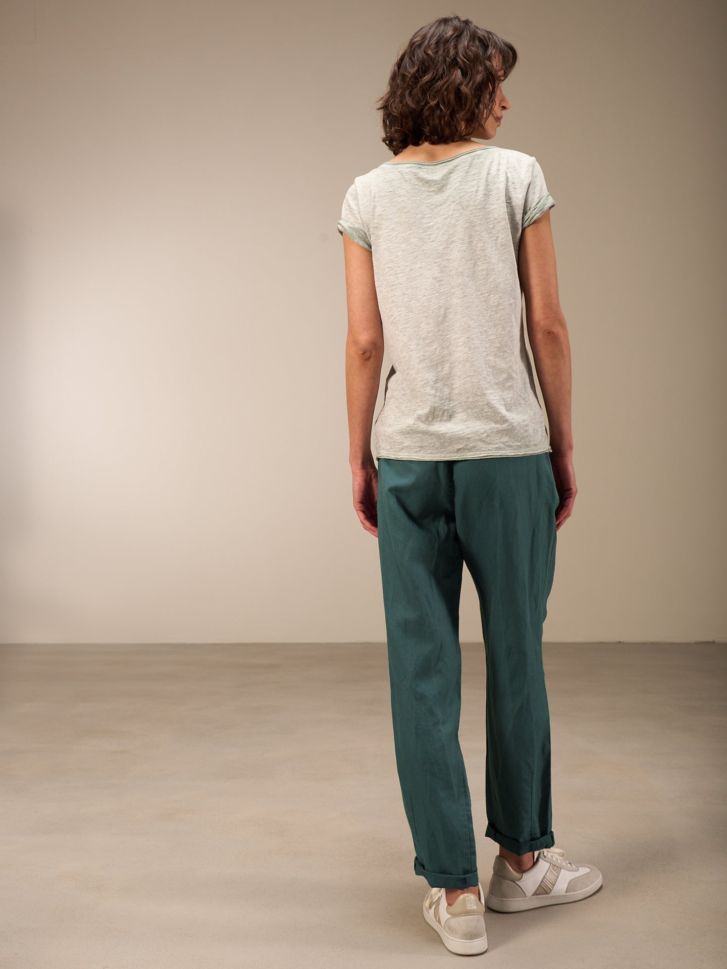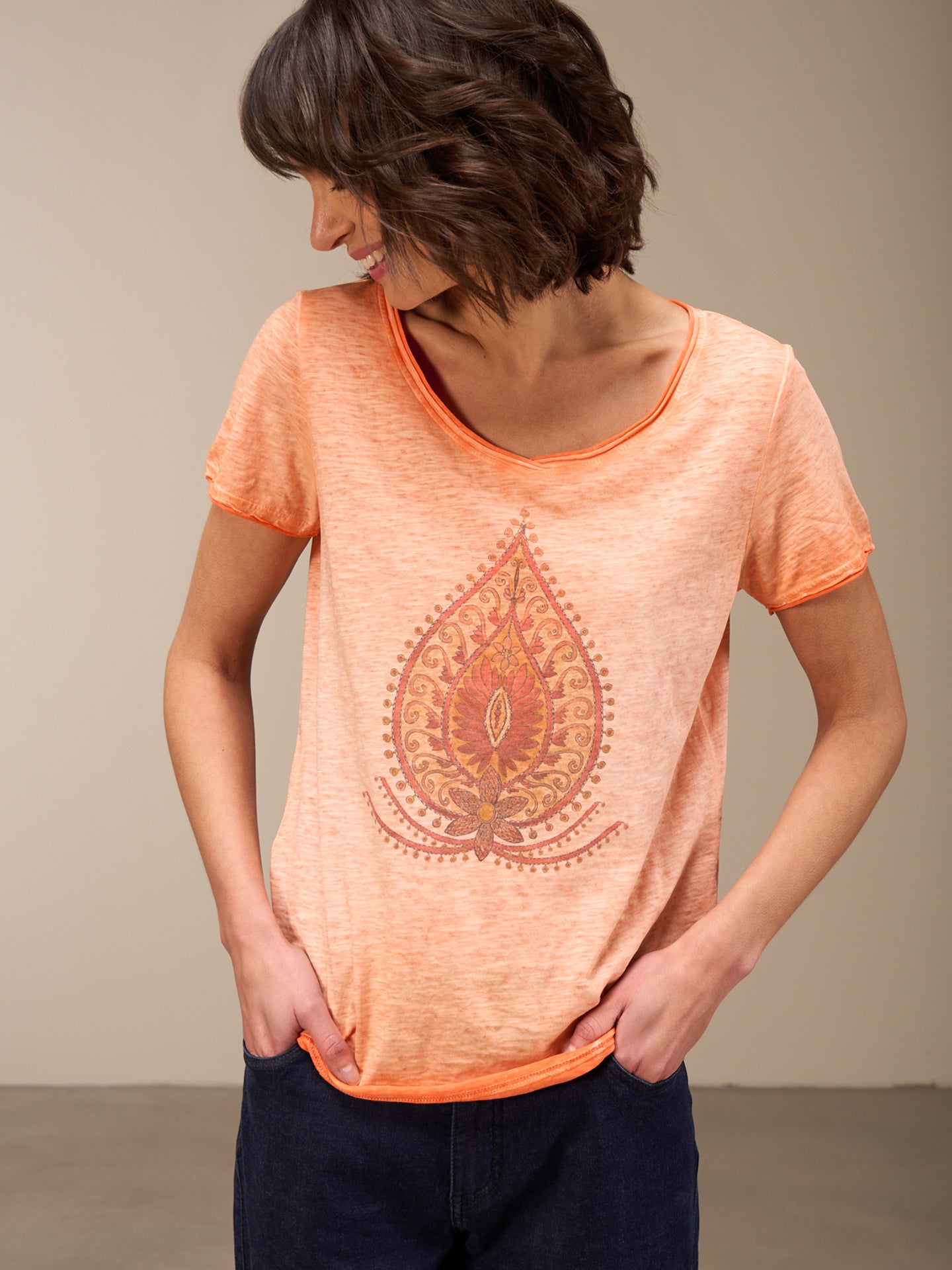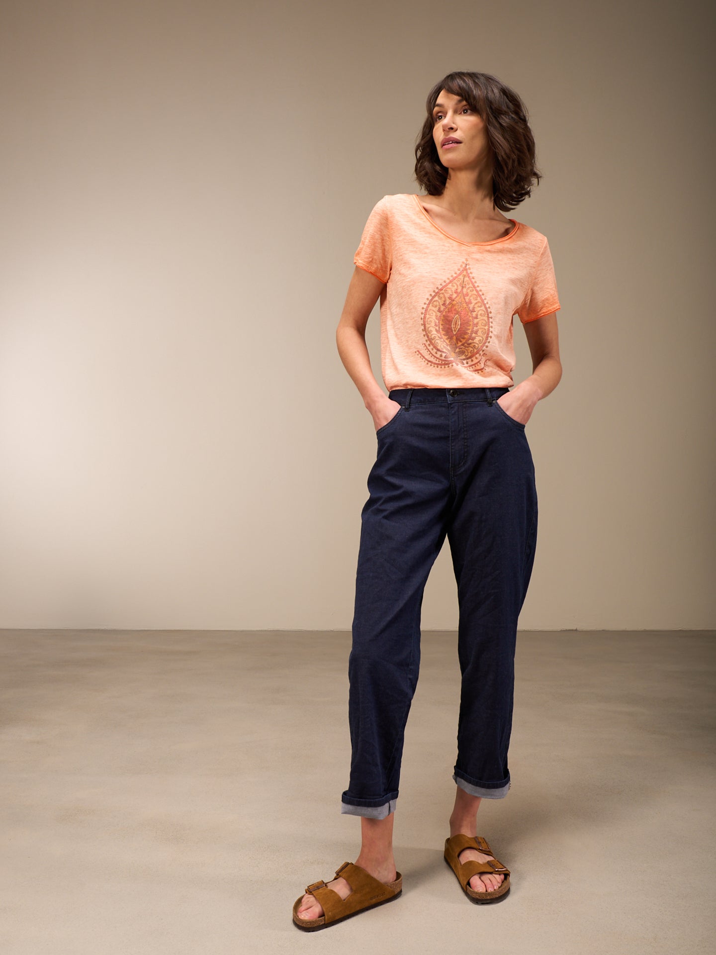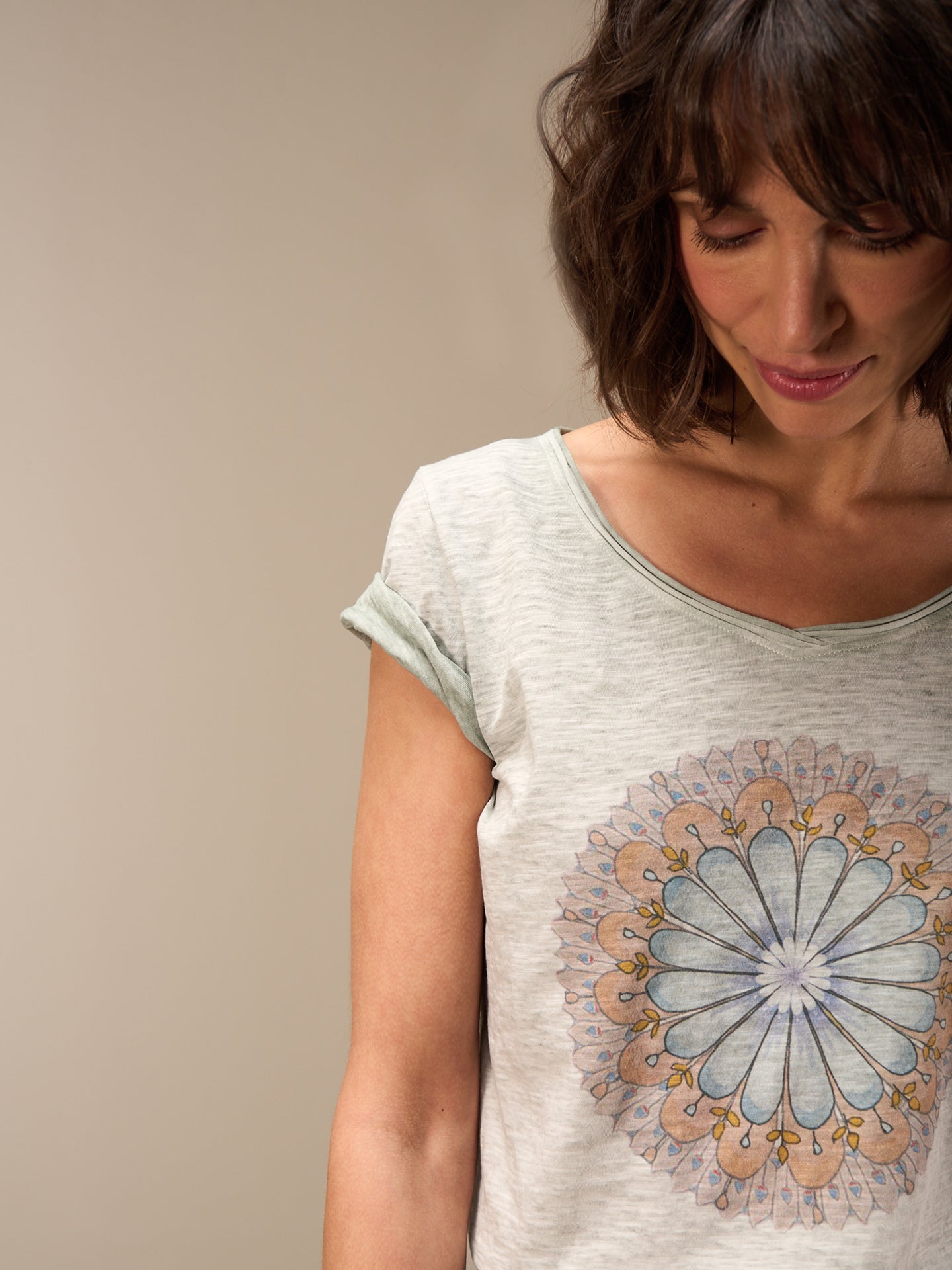 Locker geschnittenes T-shirt aus geflammtem Jersey mit platziertem Druck und offenkantigem V-Ausschnitt. 100% GOTS-zertifizierte Bio-Baumwollqualität. Durch ein spezielles inwendiges Färbeverfahren erhält das Shirt einen schönen ausgewaschenen Look. Unregelmässigkeiten in der Farbe machen das Stück einzigartig. Der Ausbleicheffekt wird verstärkt.