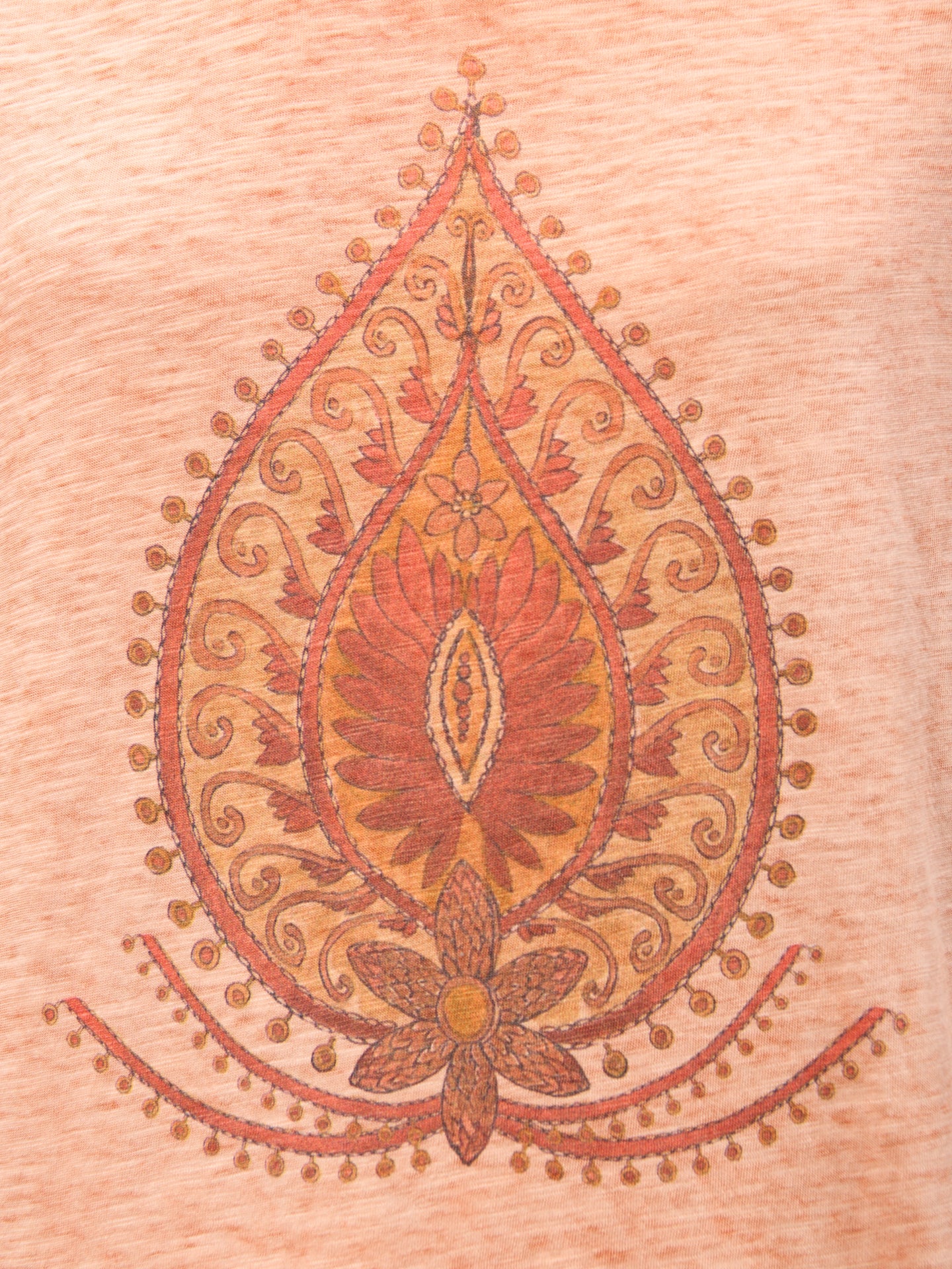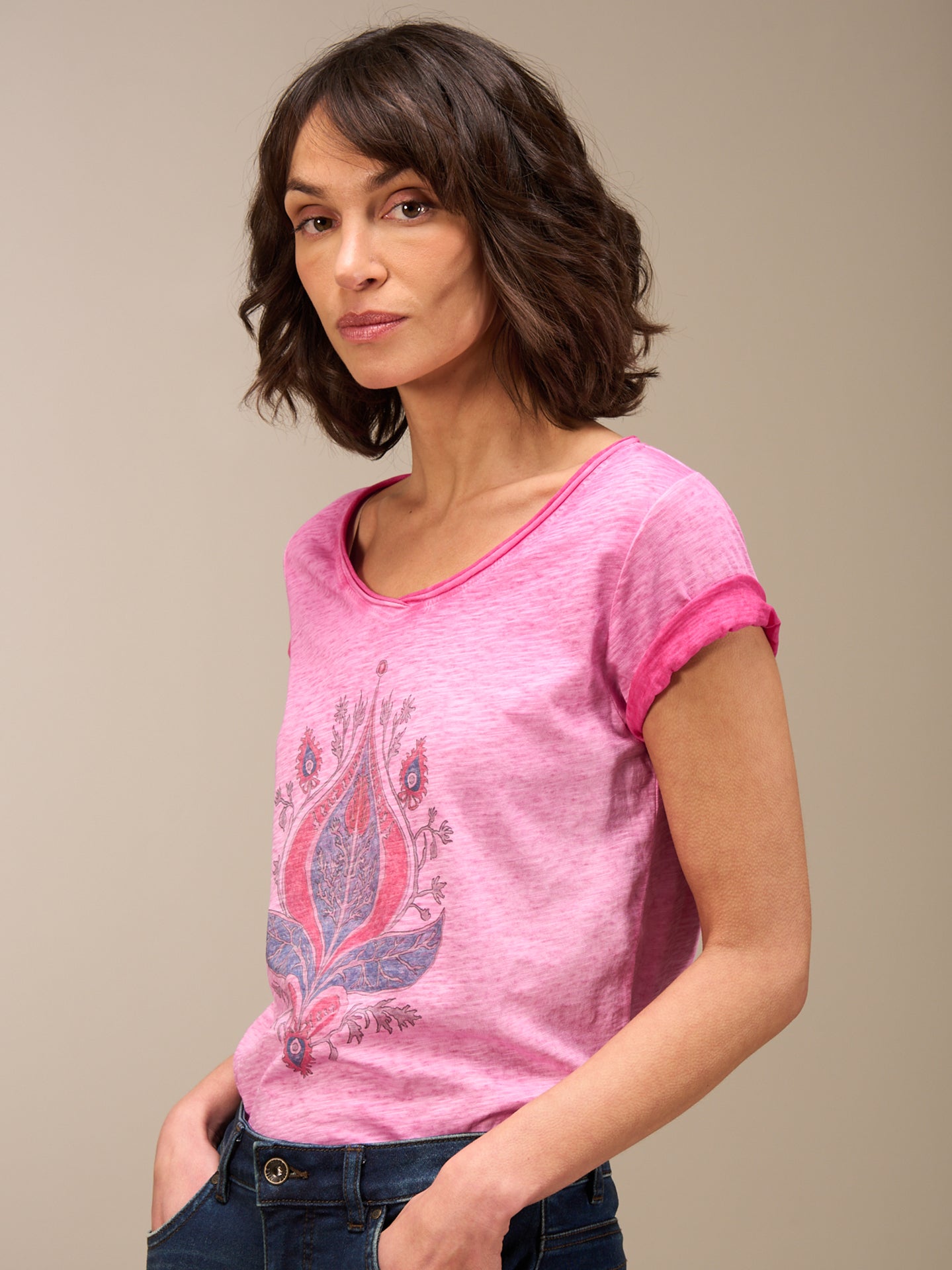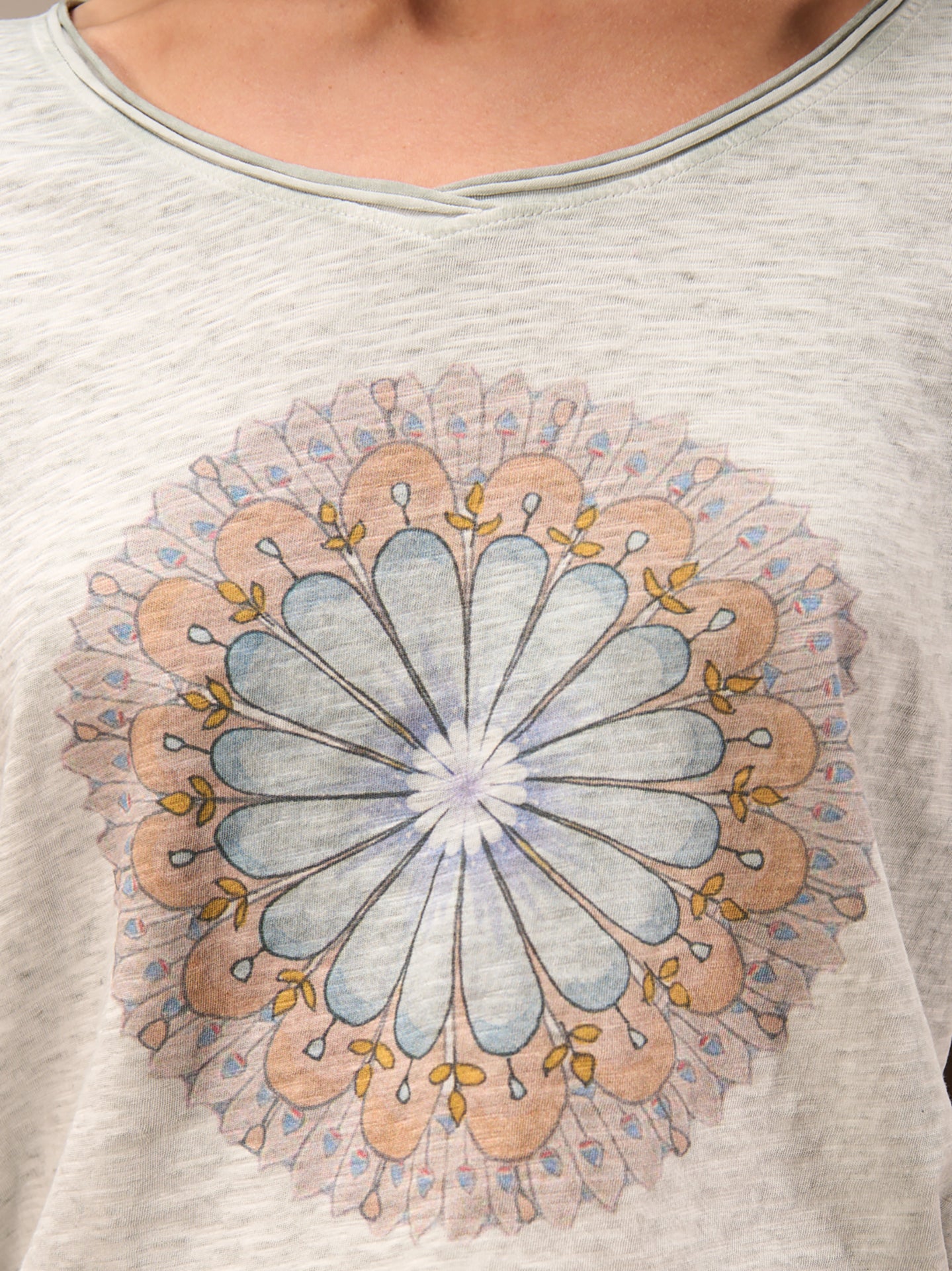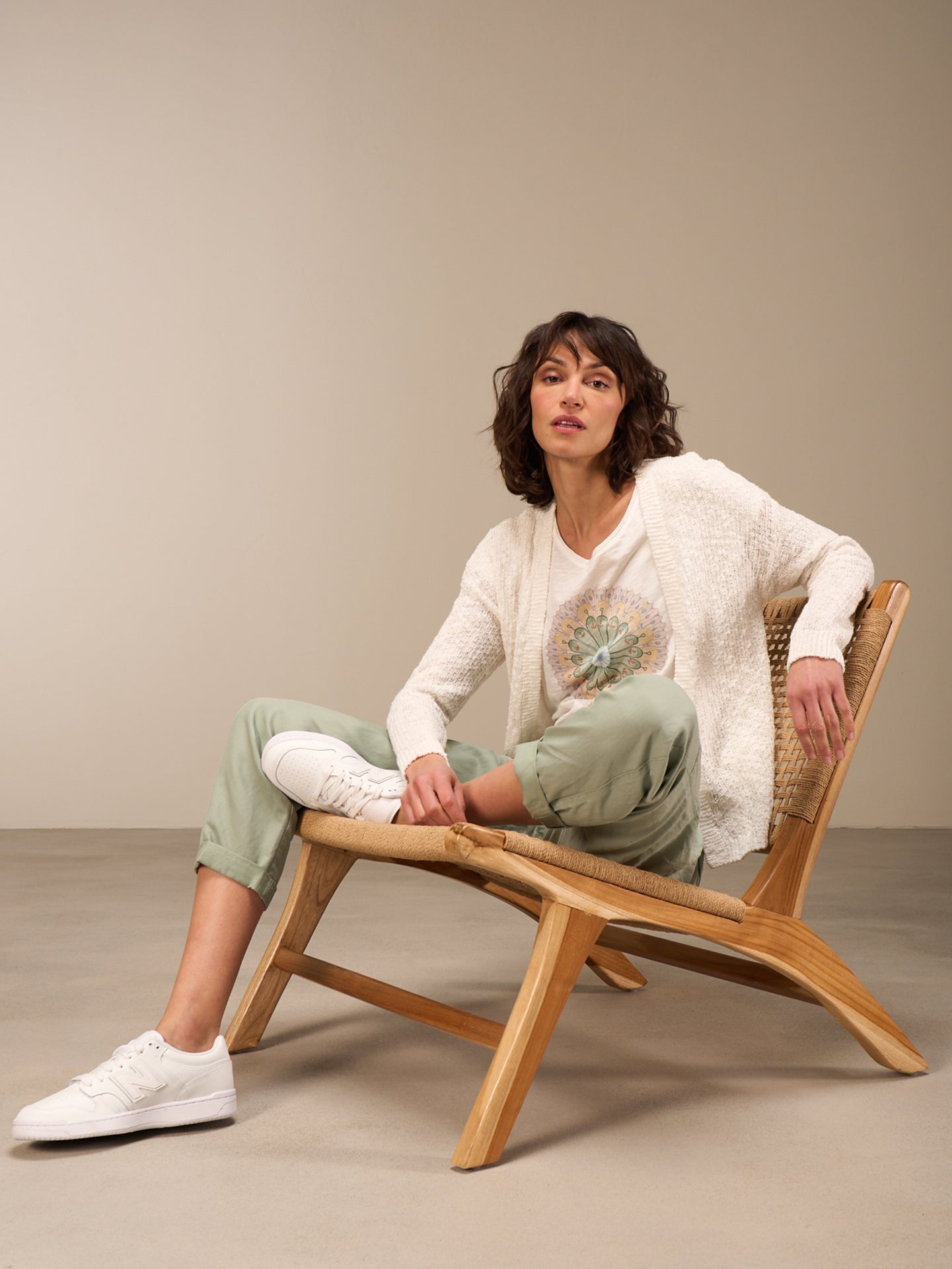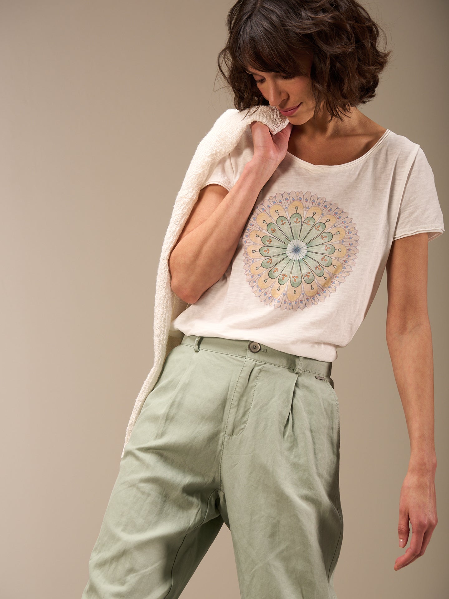 Locker geschnittenes T-shirt aus geflammtem Jersey mit platziertem Druck und offenkantigem V-Ausschnitt. 100% GOTS-zertifizierte Bio-Baumwollqualität. Durch ein spezielles inwendiges Färbeverfahren erhält das Shirt einen schönen ausgewaschenen Look. Unregelmässigkeiten in der Farbe machen das Stück einzigartig. Der Ausbleicheffekt wird verstärkt.