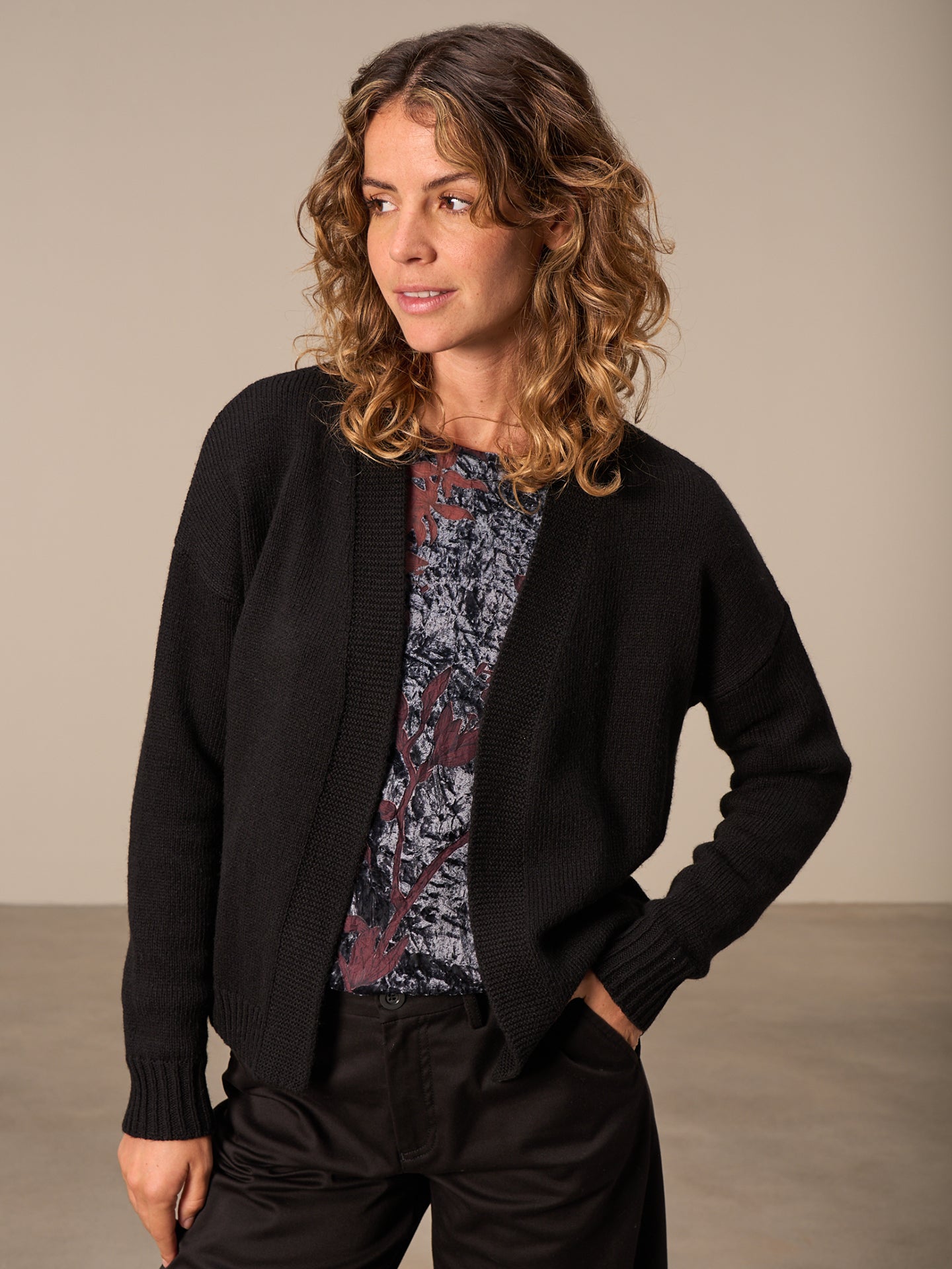 Locker geschnittene Strickjacke mit V-Ausschnitt und Rip-Borten an Ausschnitt und Ärmeln.
