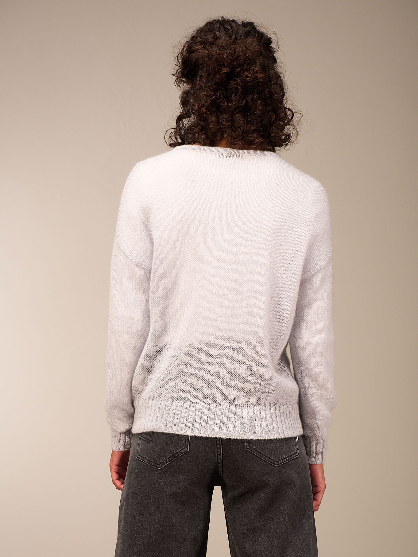 Gerade geschnittener Pullover mit leicht überschnittenen Schultern und dekorativer Perlmuttknopfleiste am Rundhalsausschnitt. Die leicht ballonförmigen Bischofärmel und die leicht transparente Optik macht den Pulli zum perfekten Kombipartner und hat Lieblingsteilpotential.