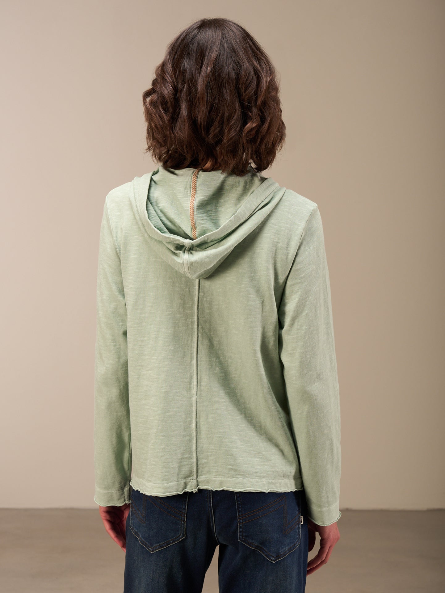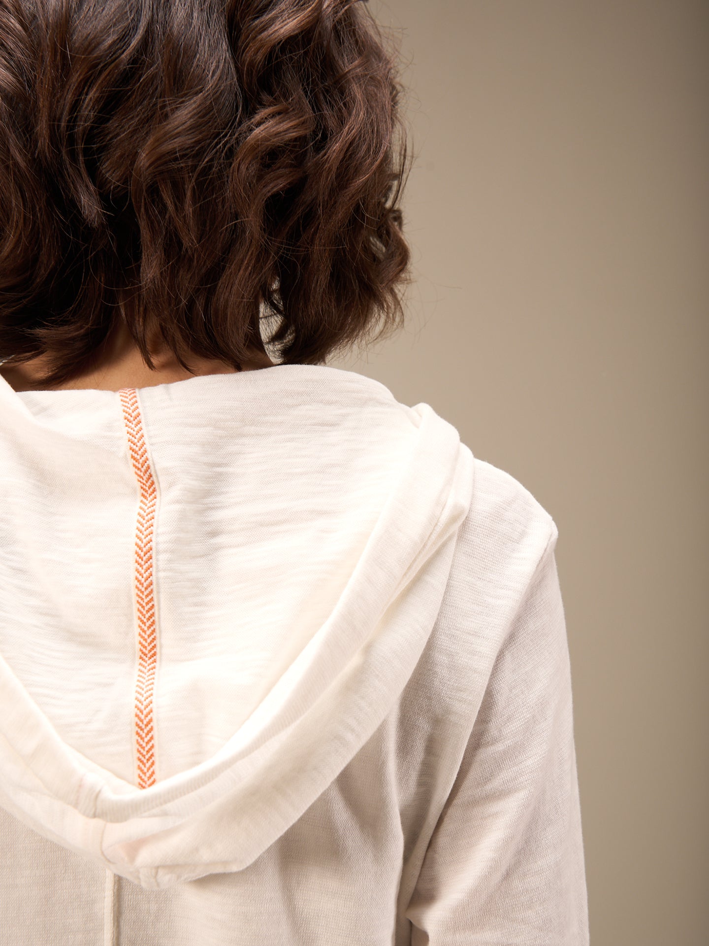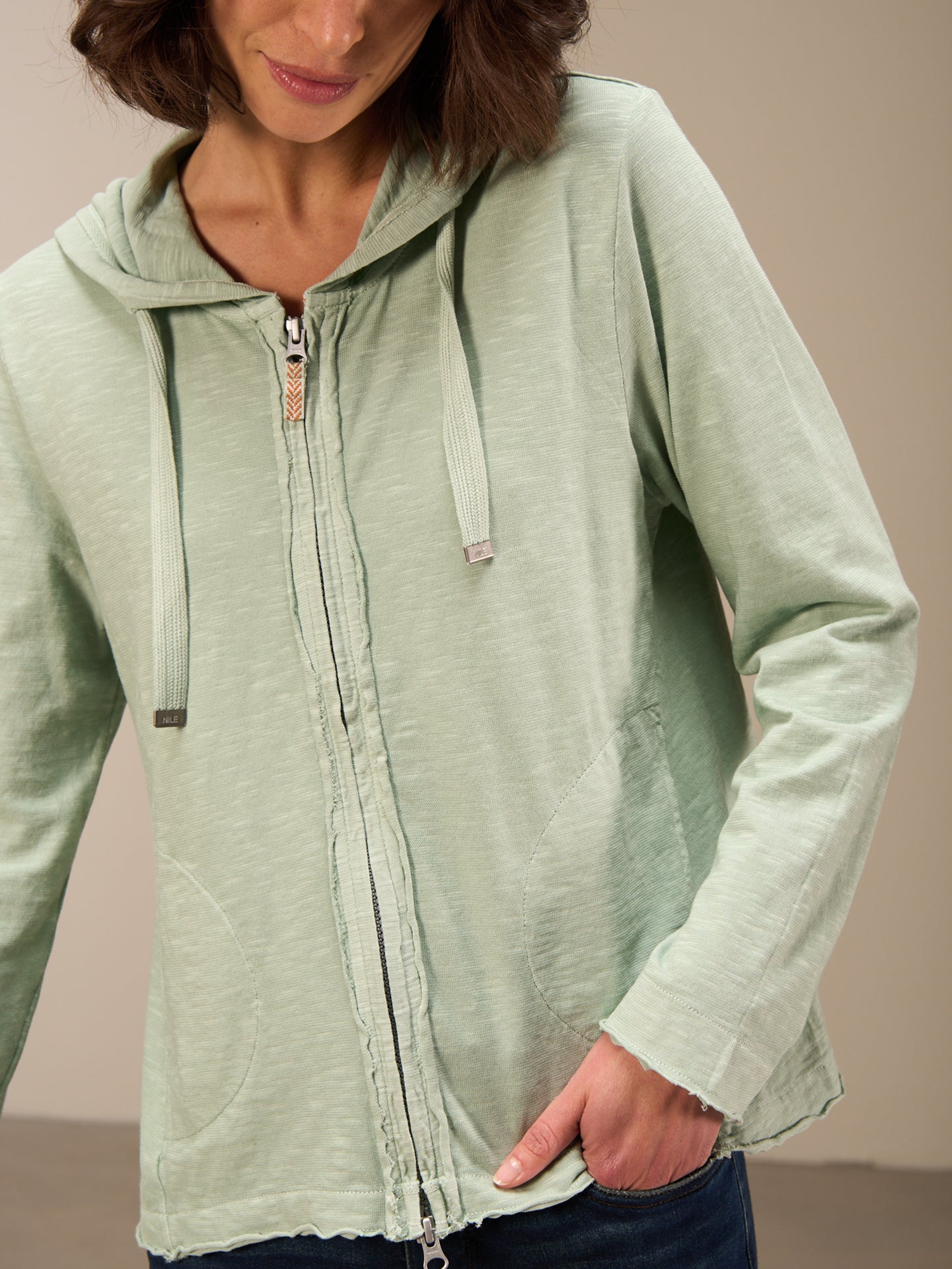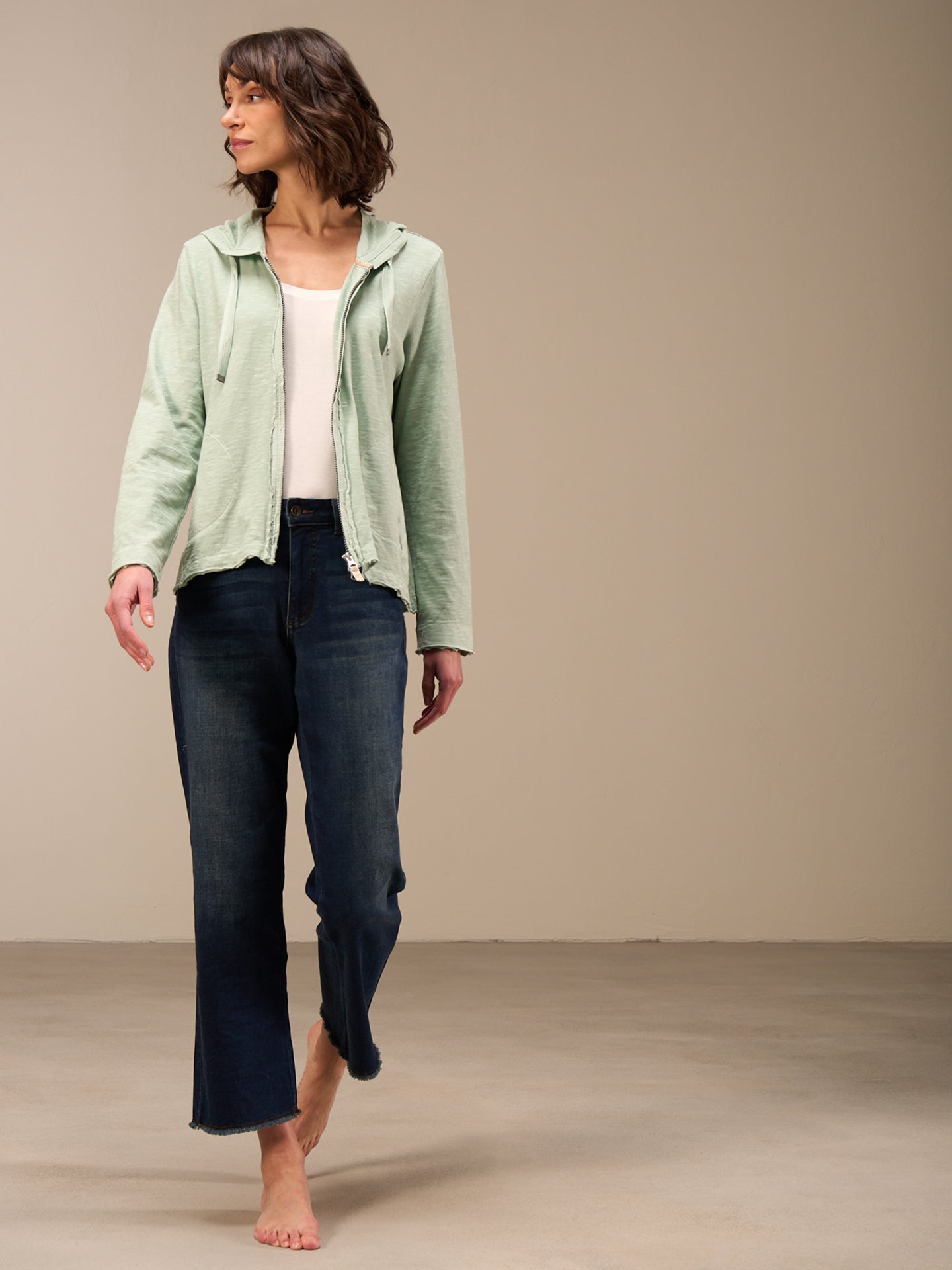 Sportive Sweatjacke in bequemer A-Shape mit Kapuze und praktischen seitlichen Taschen an nach vorne gedrehten Seitennähten. Das hochwertigem gewirkte Jerseymaterial, ein praktischer Zweiweg-Reissverschluss und offenkantige Säume runden den Style ab. Stückgefärbt in pigment-dye Verfahren