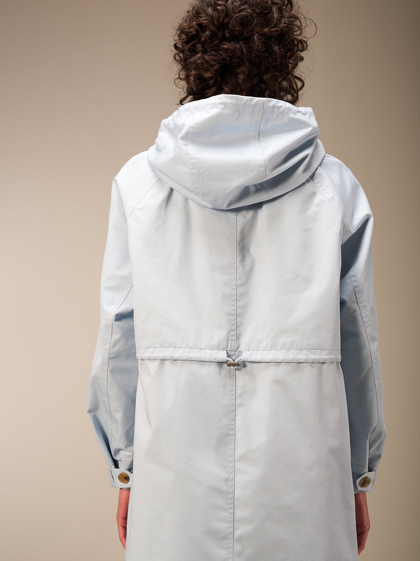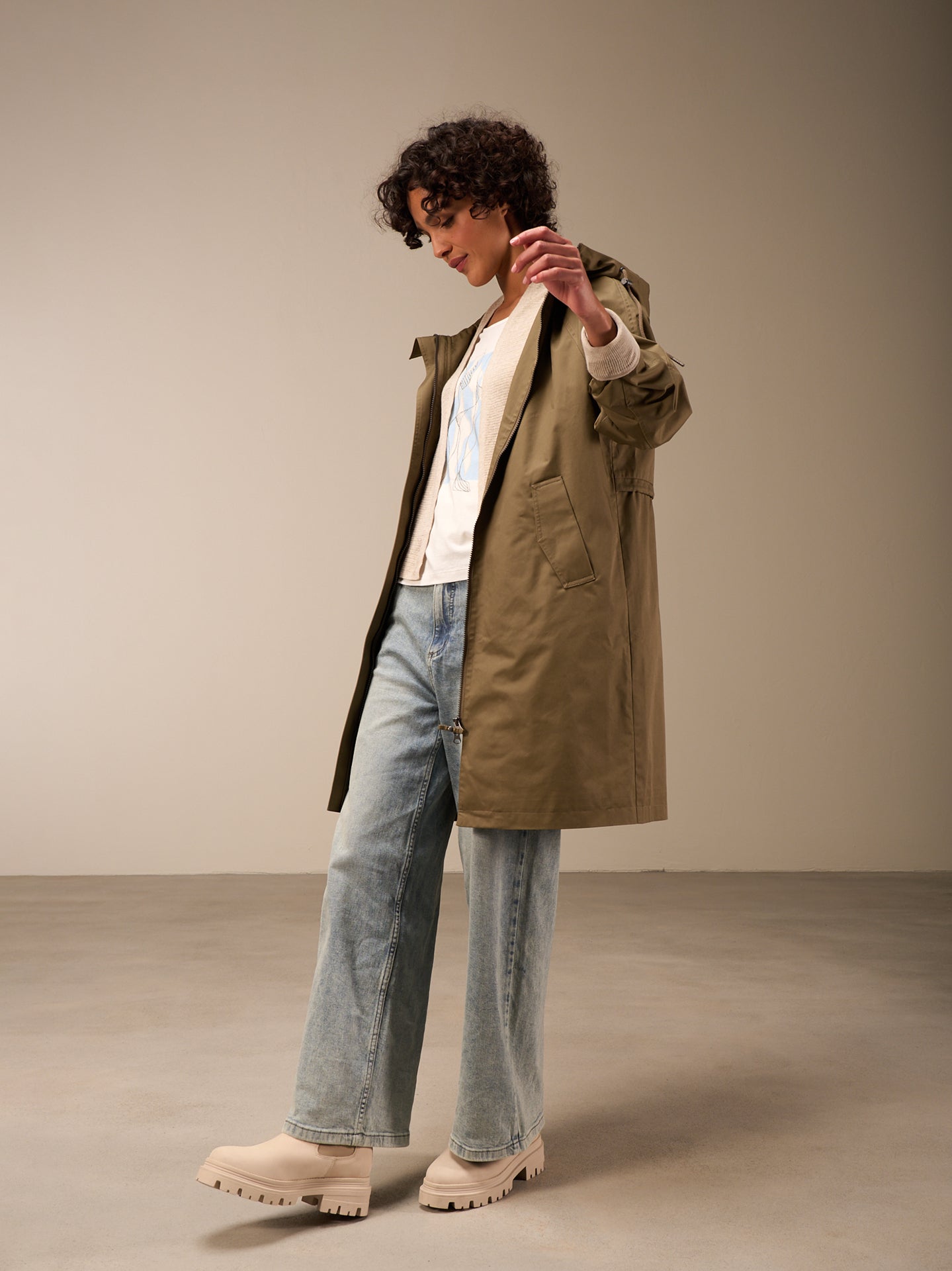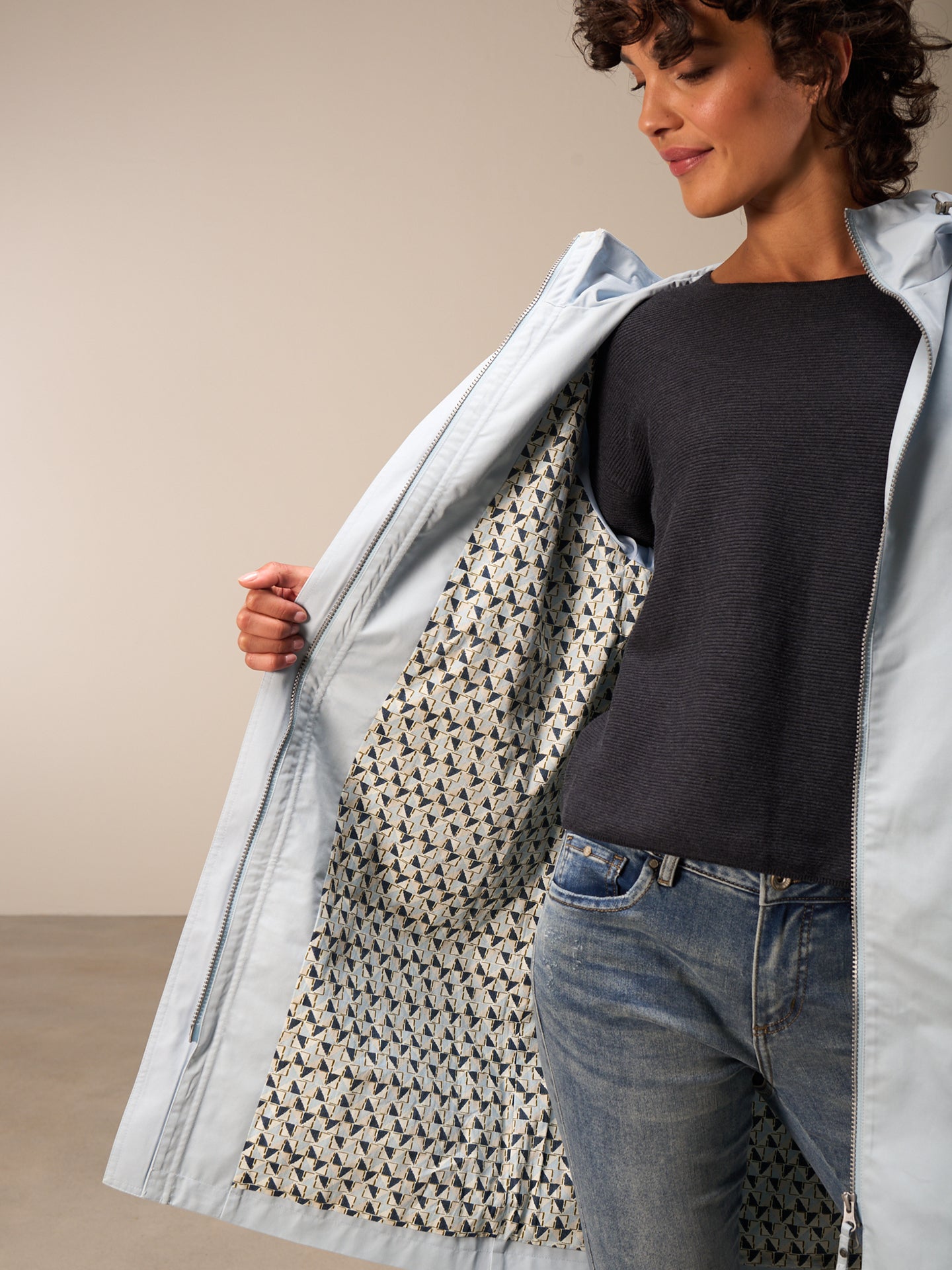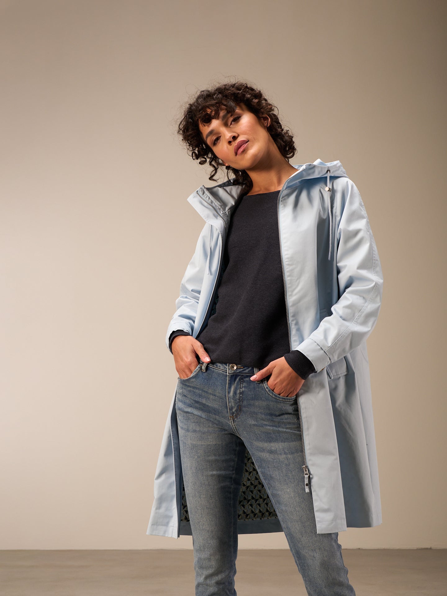 Angesagter weiter Frühlingsmantel in wasserabweisender Qualität in legèrer A-Form mit Kapuze und funktionalem verdecktem Zweiweg-Reissverschluss.
