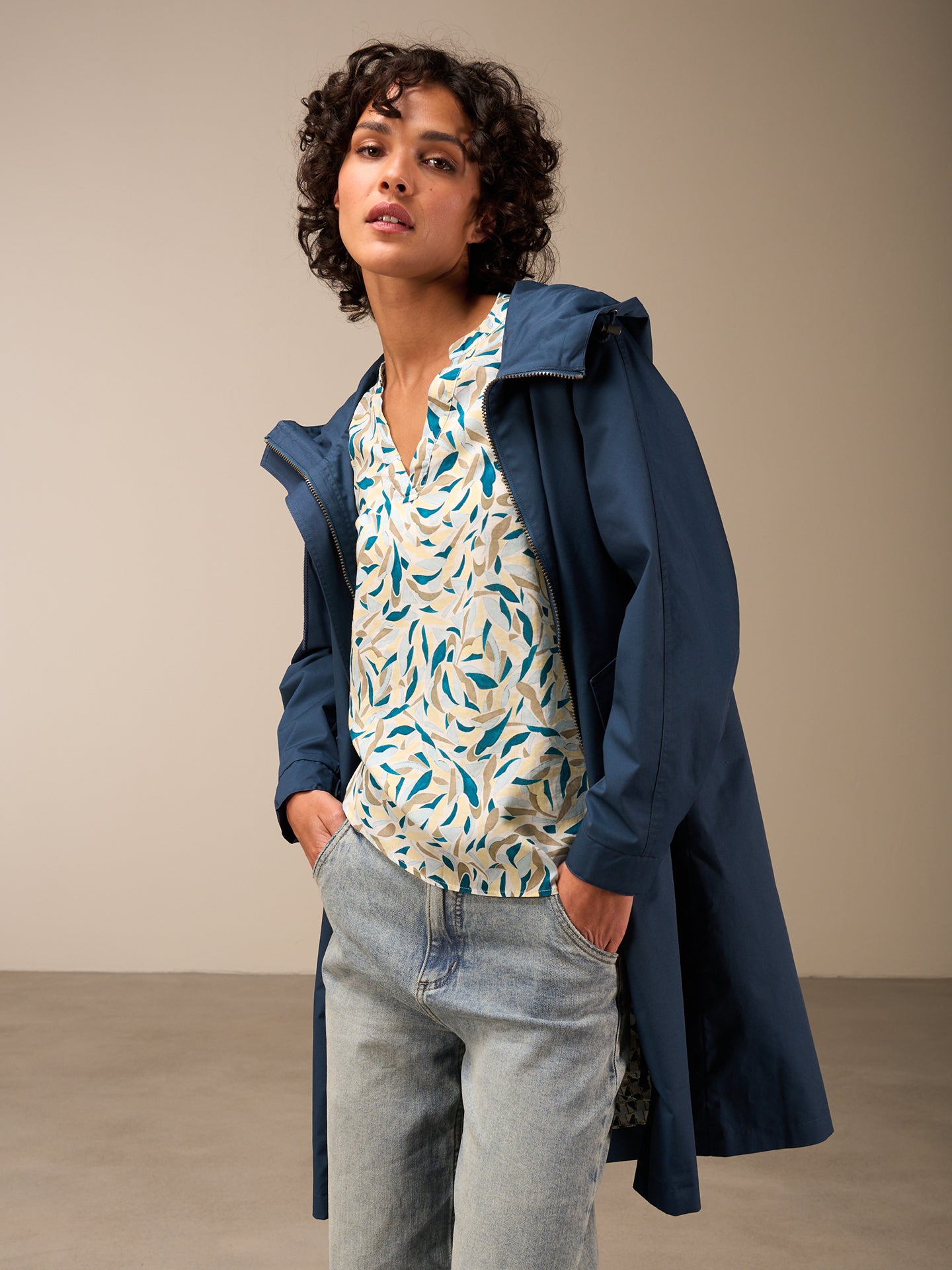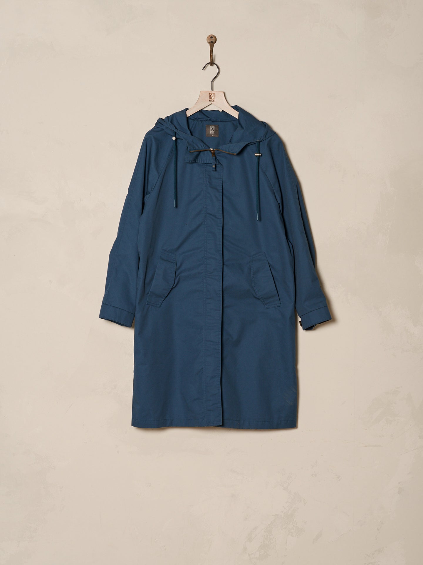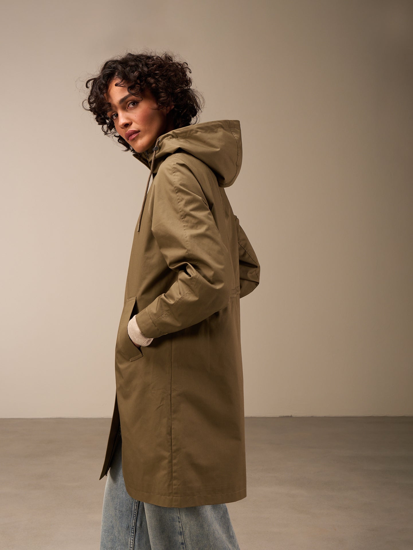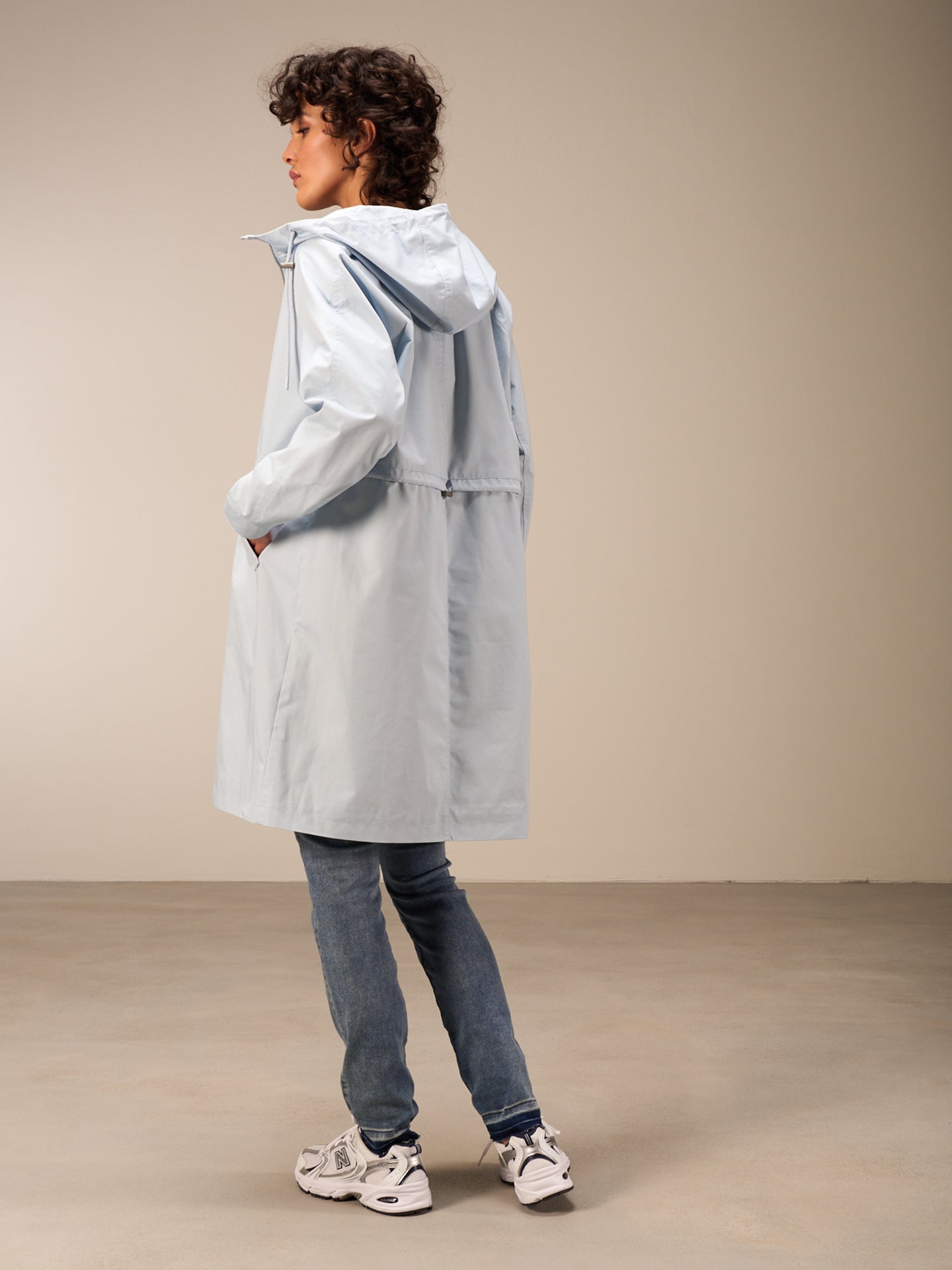 Angesagter weiter Frühlingsmantel in wasserabweisender Qualität in legèrer A-Form mit Kapuze und funktionalem verdecktem Zweiweg-Reissverschluss.