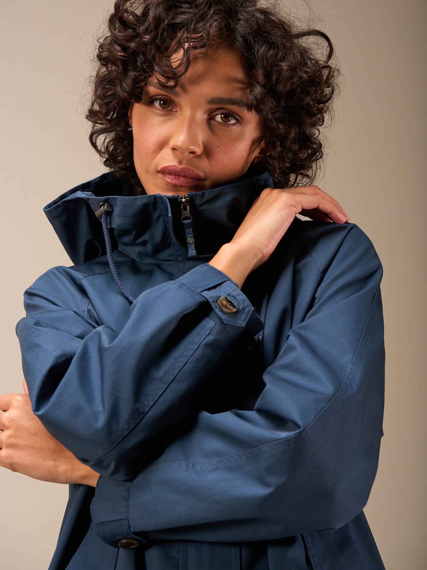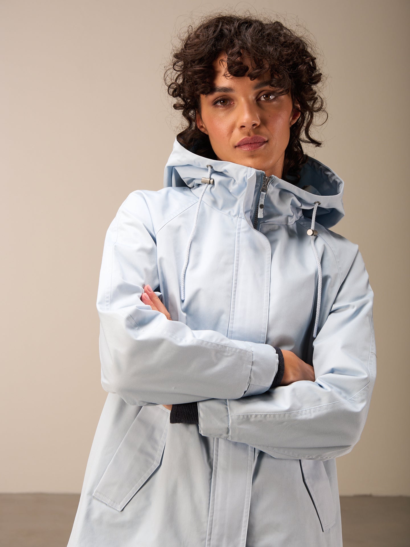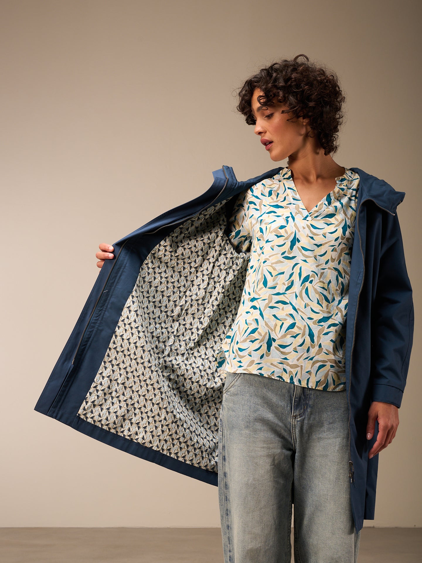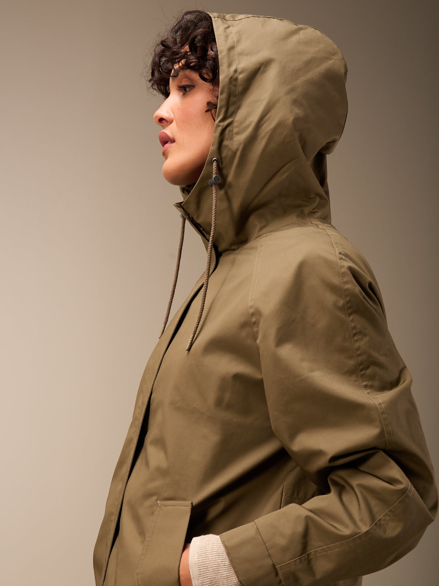 Angesagter weiter Frühlingsmantel in wasserabweisender Qualität in legèrer A-Form mit Kapuze und funktionalem verdecktem Zweiweg-Reissverschluss.