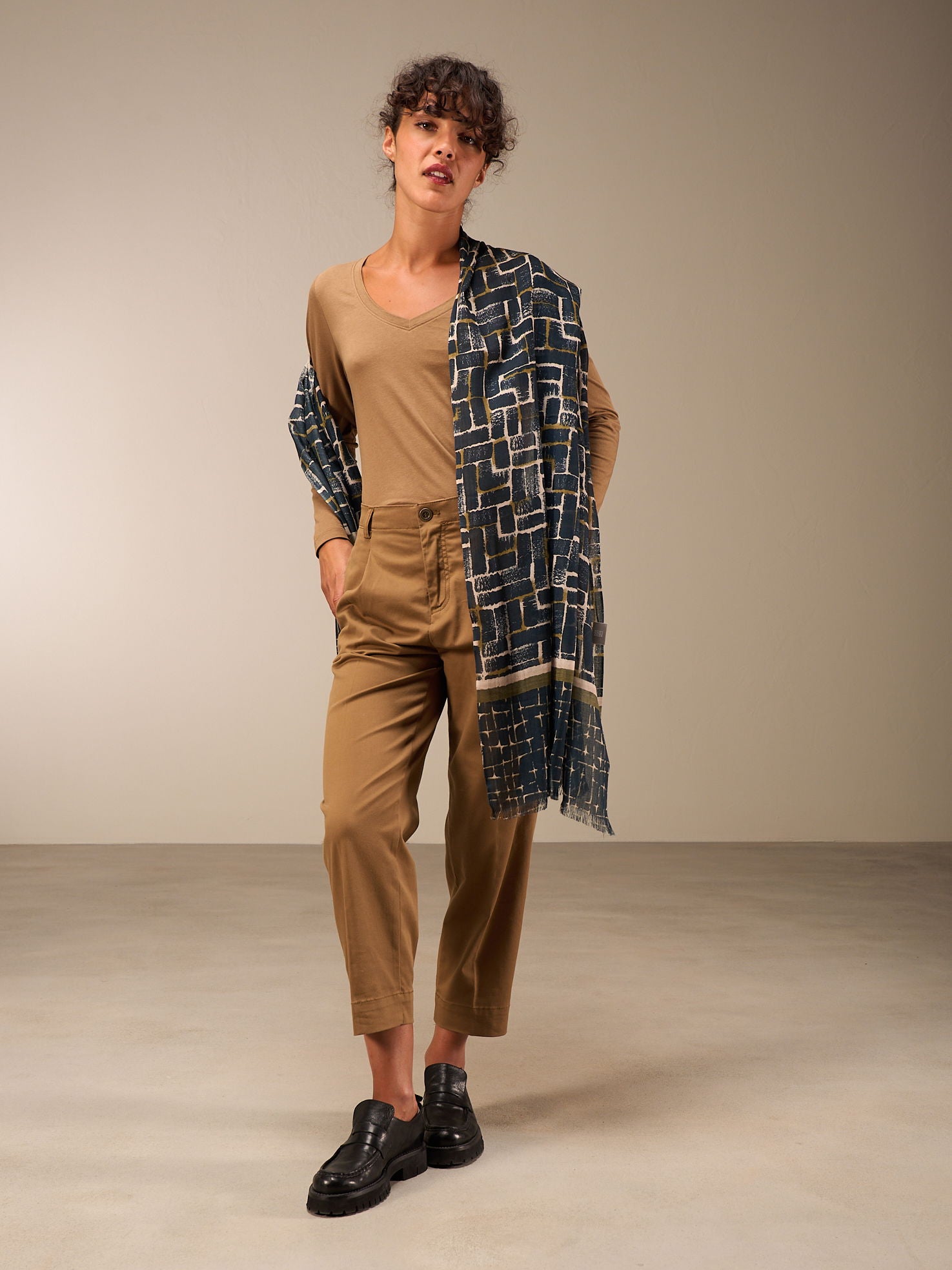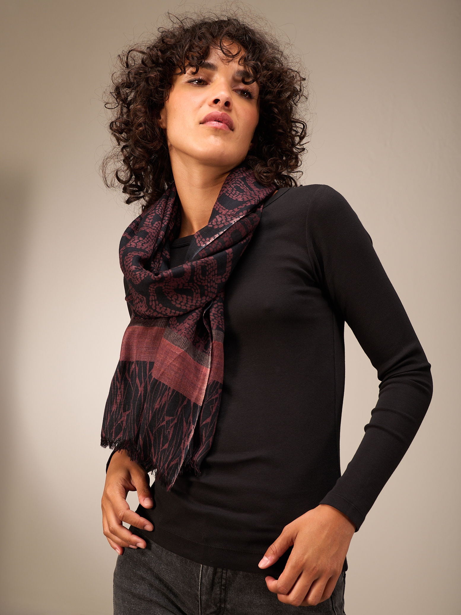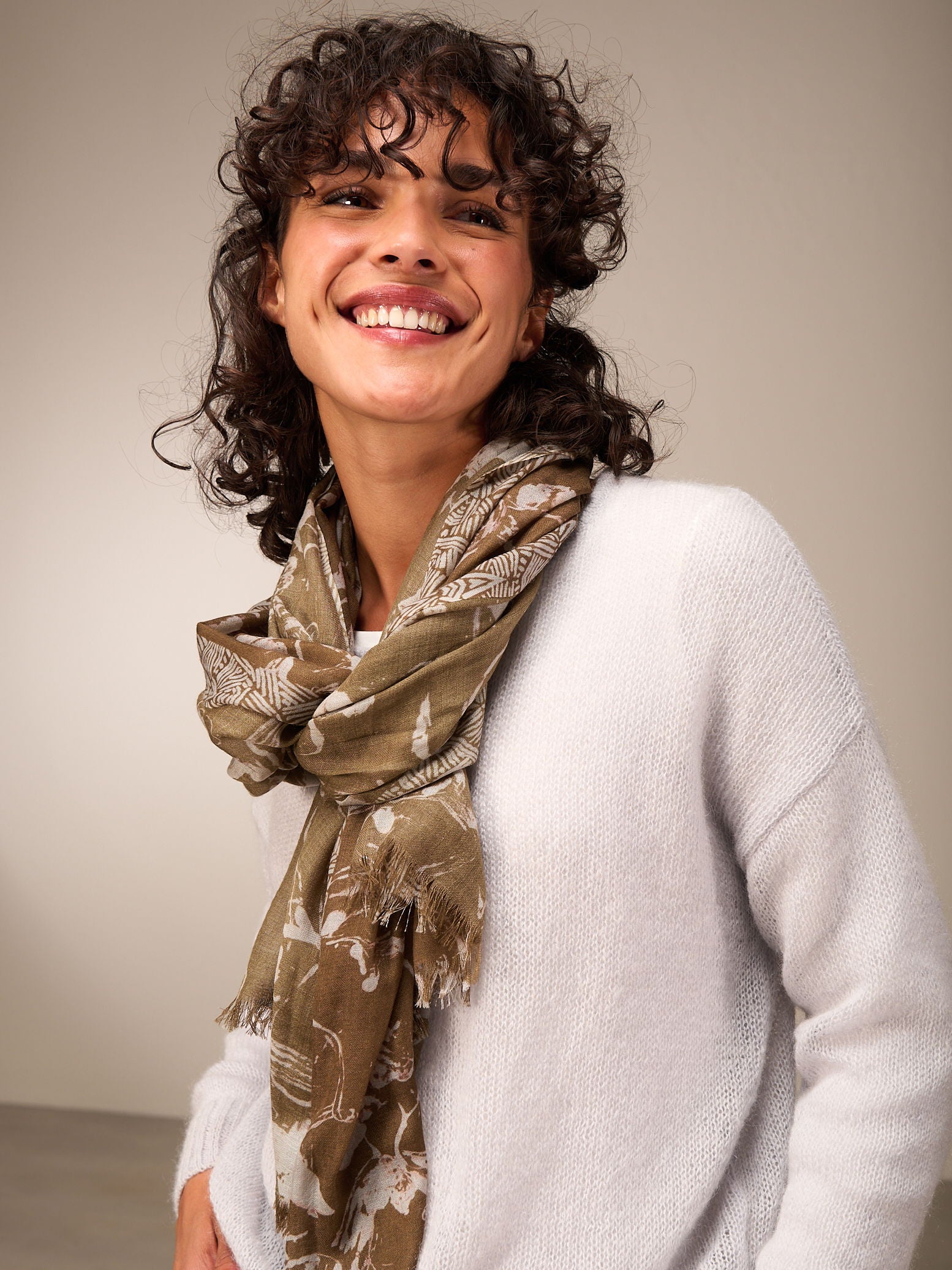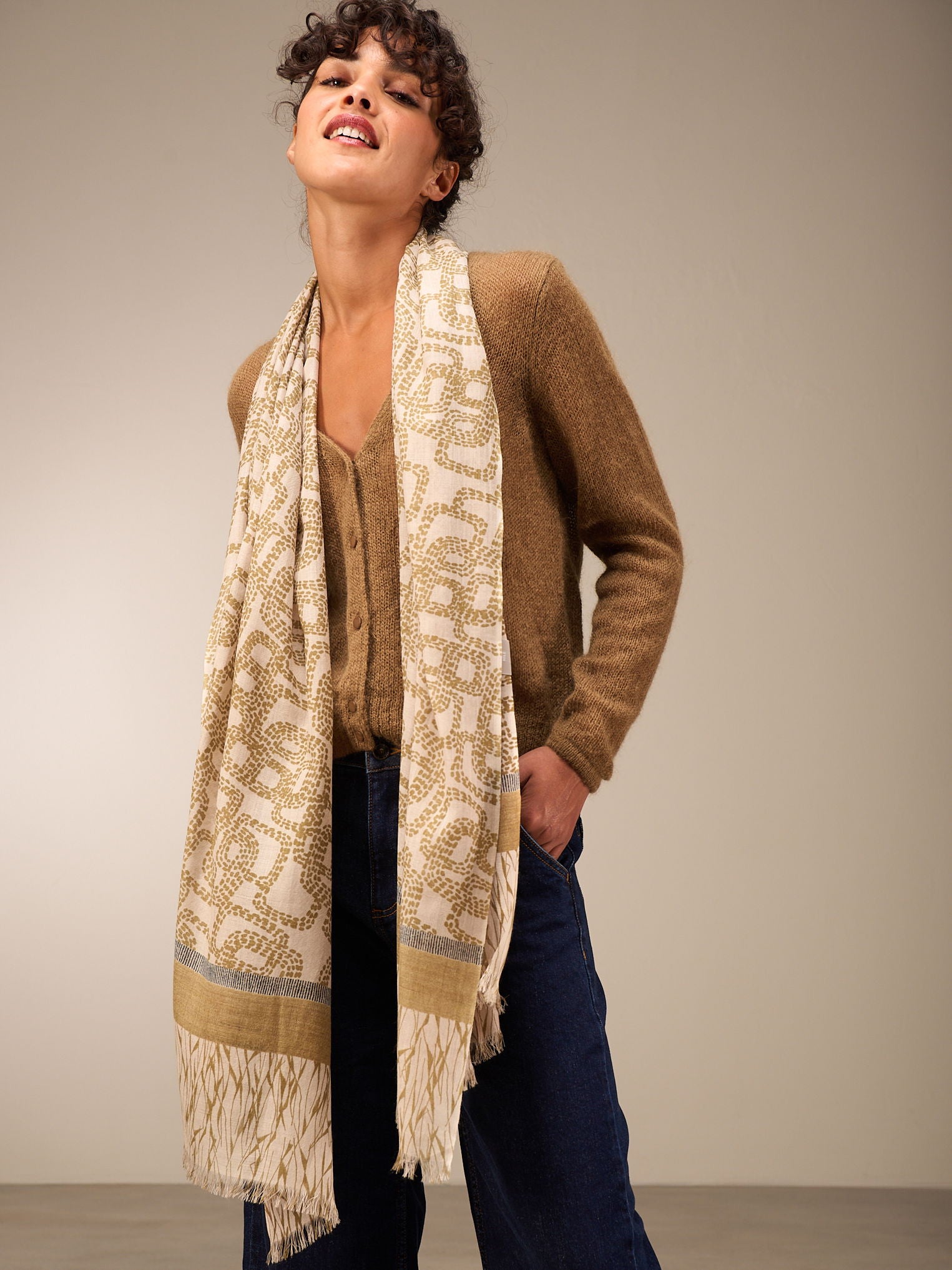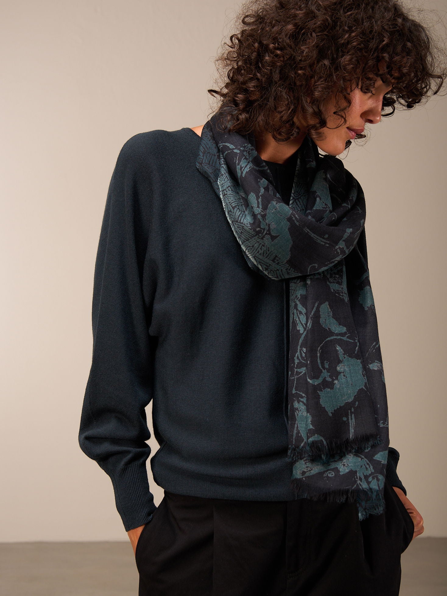 Hochwertiger Schal mit handgezeichnetem Alloverprint in der Grösse 70x200cm. 100% Wolle mit einer gewobenen Kante und kurzen Fransen.