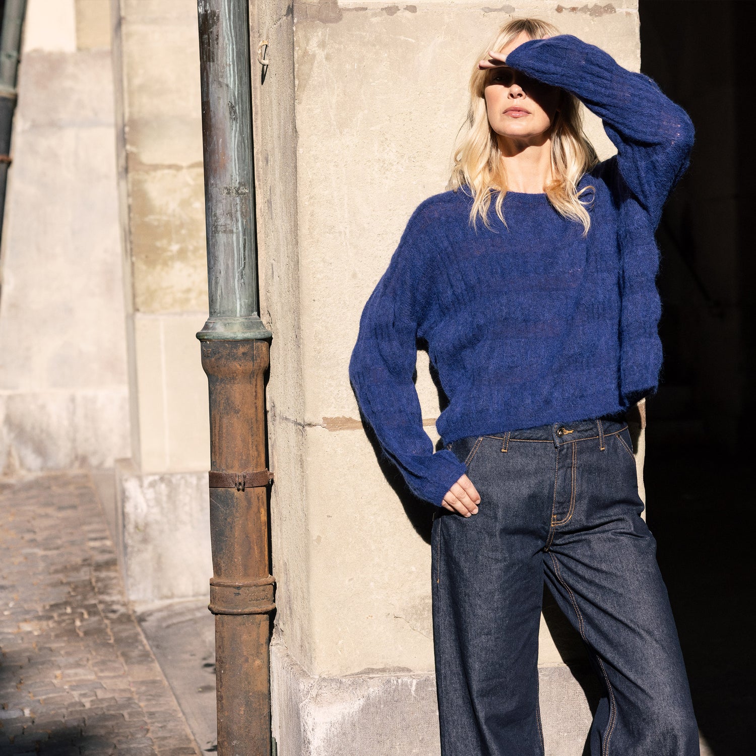 Der kuschelige Pullover in Cobalt trifft auf weit geschnittene Denim mit markanter Naht. Ein Statement-Look für kühle Herbsttage, der Komfort und Stil perfekt vereint.